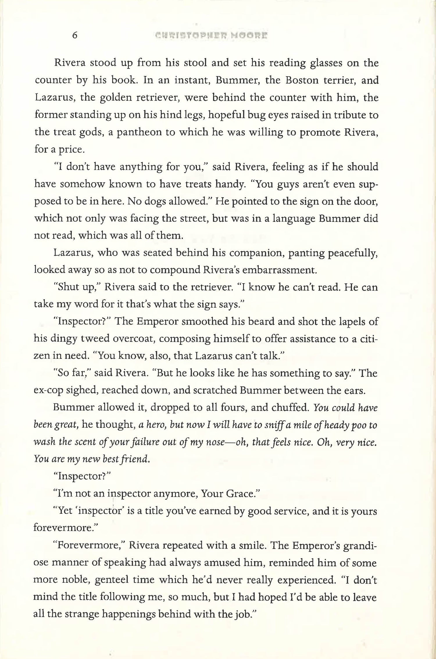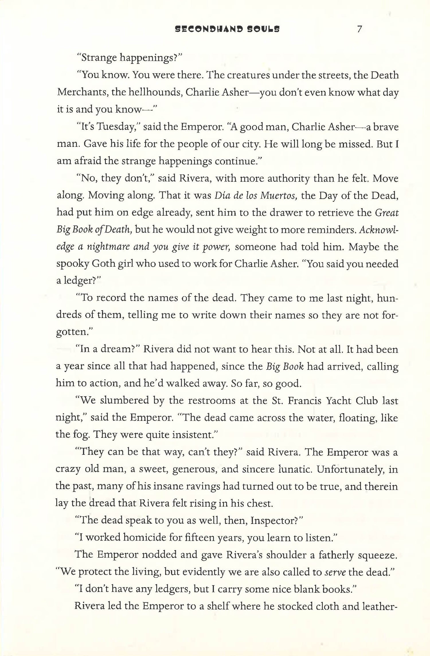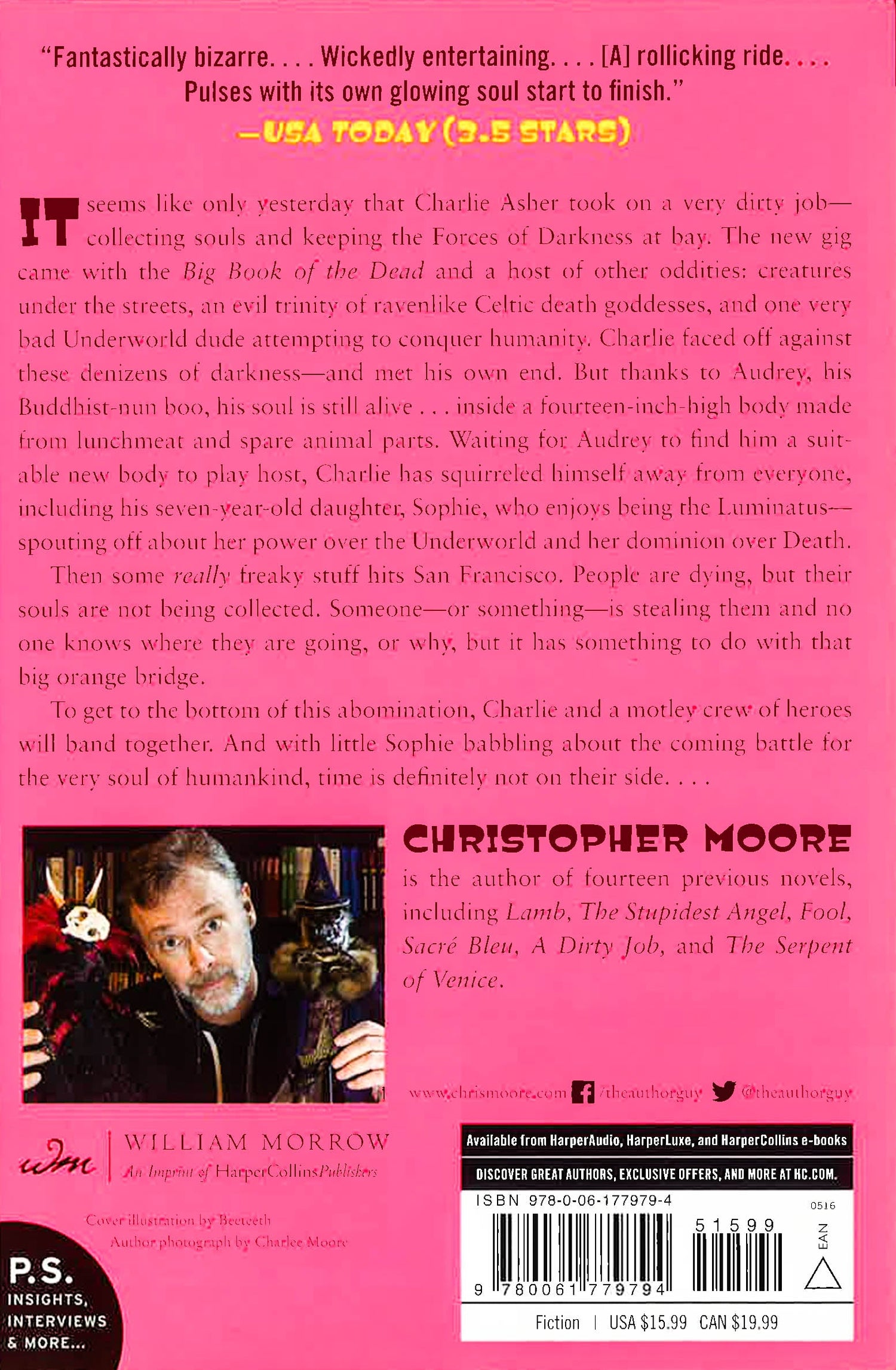 Something really strange is happening in the City by the Bay. People are dying, but their souls are not being collected. Someone - or something - is stealing them and no one knows where they are going, or why, but it has something to do with that big orange bridge. Death Merchant Charlie Asher is just as flummoxed as everyone else. He’s trapped in the body of a fourteen-inch-tall "meat puppet" waiting for his Buddhist nun girlfriend, Audrey, to find him a suitable new body to play host.To get to the bottom of this abomination, a motley crew of heroes will band together: the seven-foot-tall death merchant Minty Fresh; retired policeman turned bookseller Alphonse Rivera; the Emperor of San Francisco and his dogs, Bummer and Lazarus; and Lily, the former Goth girl. Now if only they can get little Sophie to stop babbling about the coming battle for the very soul of humankind . . .