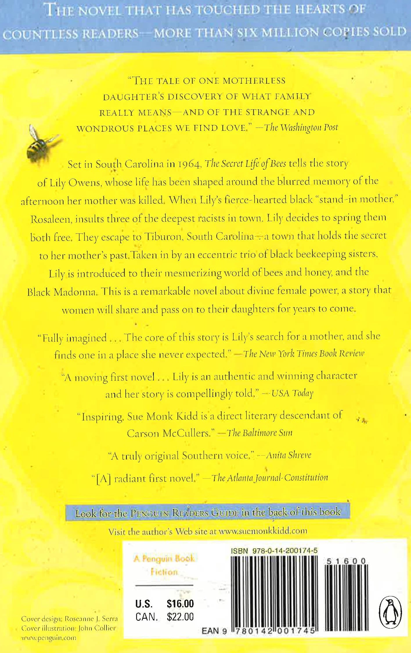 The multi-million bestselling novel about a young girl's journey towards healing and the transforming power of love, from the award-winning author of The Invention of Wings and the forthcoming novel The Book of Longings Set in South Carolina in 1964, The Secret Life of Bees tells the story of Lily Owens, whose life has been shaped around the blurred memory of the afternoon her mother was killed. When Lily's fierce-hearted black "stand-in mother," Rosaleen, insults three of the deepest racists in town, Lily decides to spring them both free. They escape to Tiburon, South Carolina--a town that holds the secret to her mother's past. Taken in by an eccentric trio of black beekeeping sister, Lily is introduced to their mesmerizing world of bees and honey, and the Black Madonna. This is a remarkable novel about divine female power, a story that women will share and pass on to their daughters for years to come.