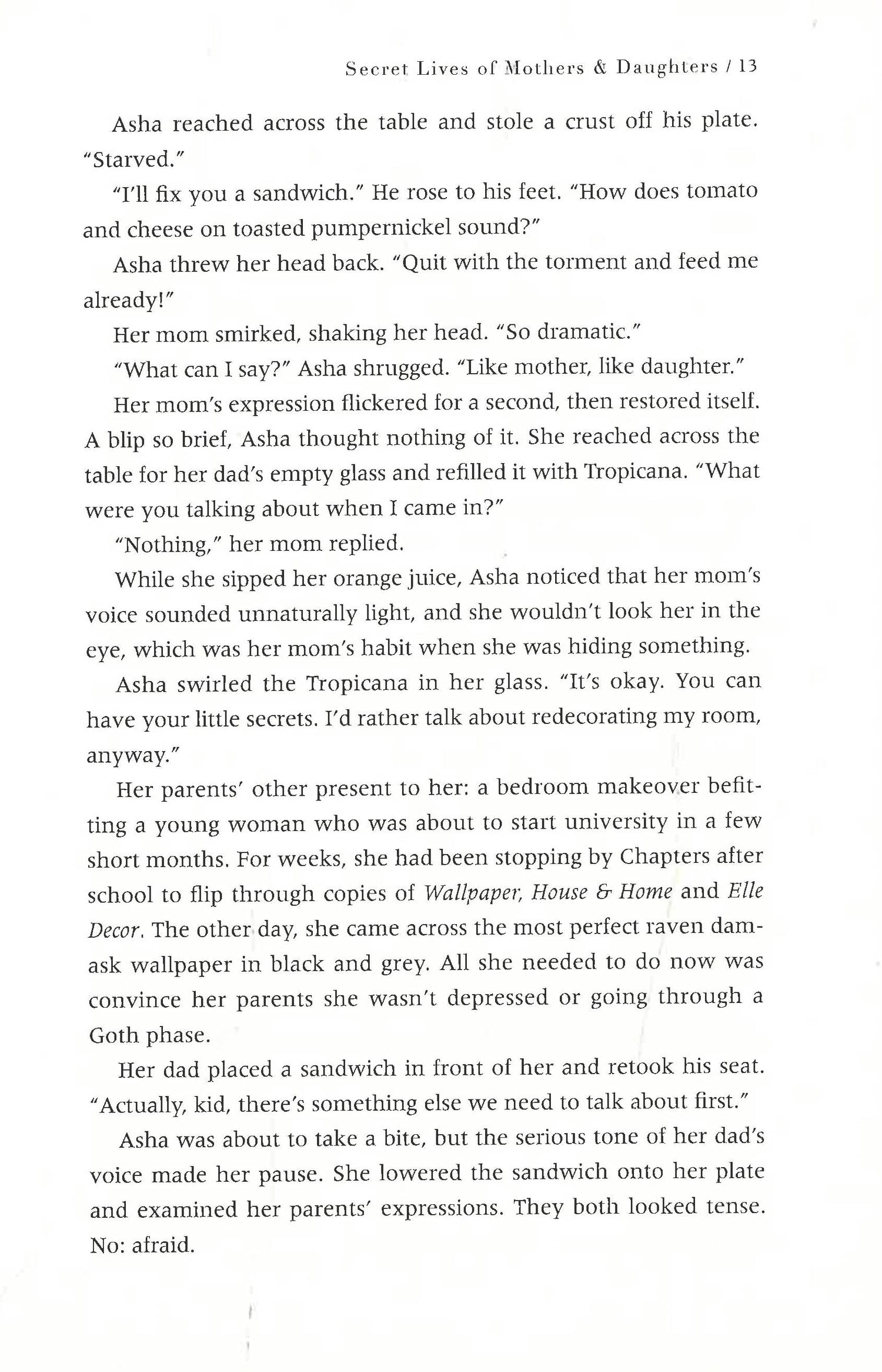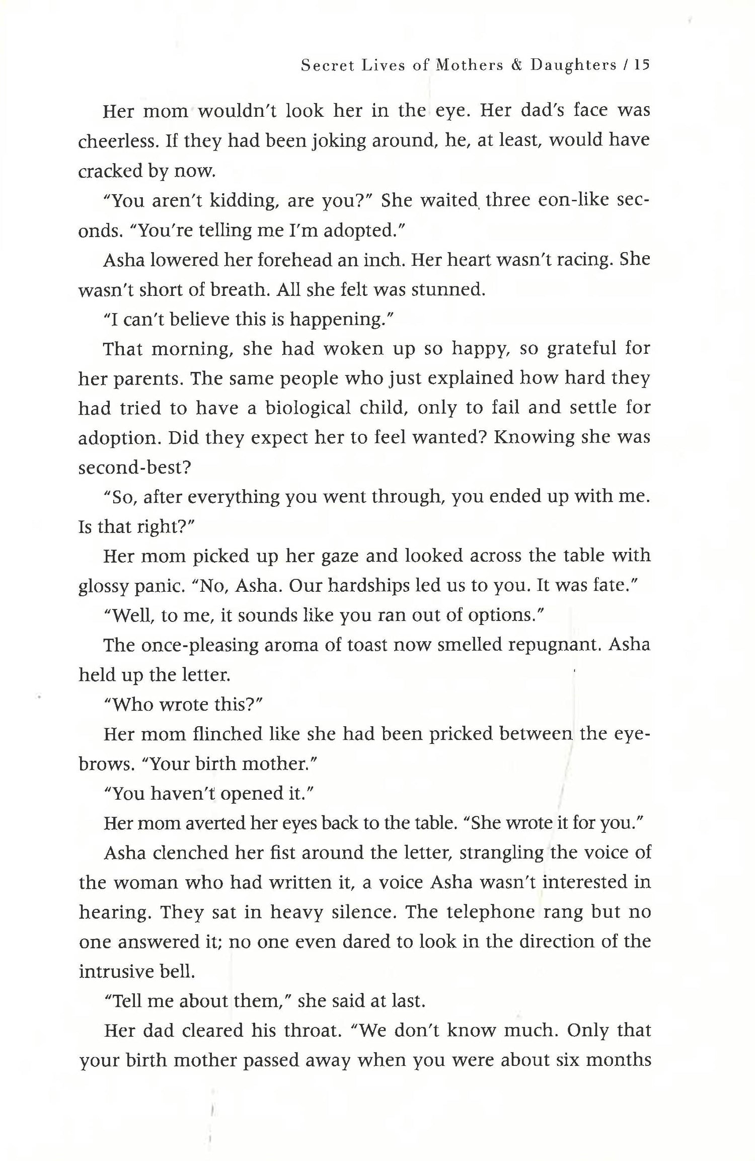 After her eighteenth birthday, Asha is devastated to learn that she was adopted as a baby. What?s more, her birth mother died of a mysterious illness, leaving Asha with only a letter.