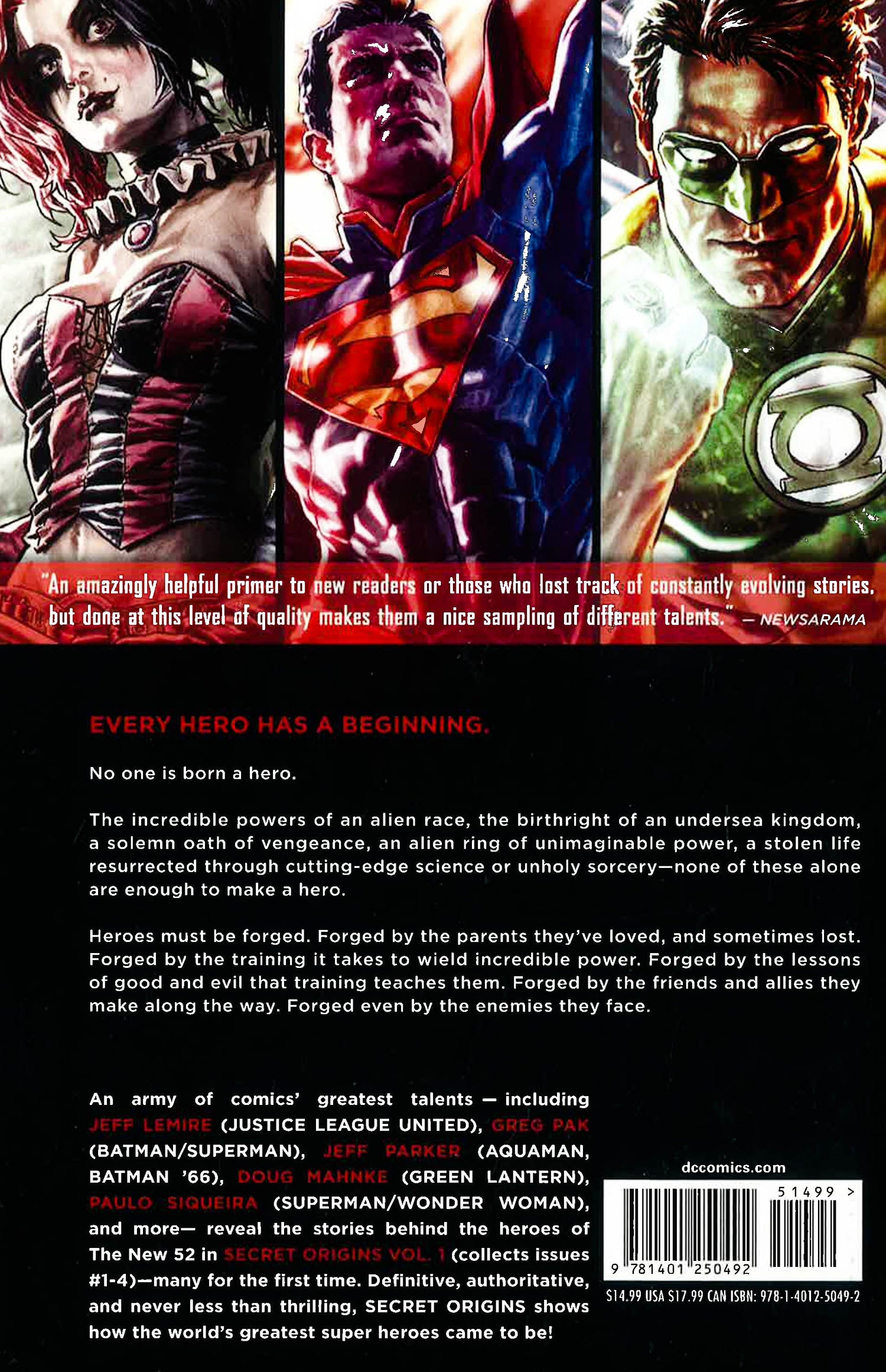 At last, the Secret Origins of the World's Greatest Heroes in The New 52 can be revealed! The beginnings of the most popular characters in the DC Universe are finally told here, in stories that fans have been clamoring for since September 2011. Included here are the origins of The Last Son of Krypton and Kara Zor-El, Supergirl, plus the first Robin, Dick Grayson. Written by a host of the industry's brightest talent including Jeff Lemire (Justice League United) Greg Pak (Batman/Superman) and Tony Bedard (Green Lantern Corps) with painted covers by Lee Bermejo (JOKER), this new series is a fantastic way to jump on with the DC Universe! Collects Secret Origins #1-4.
