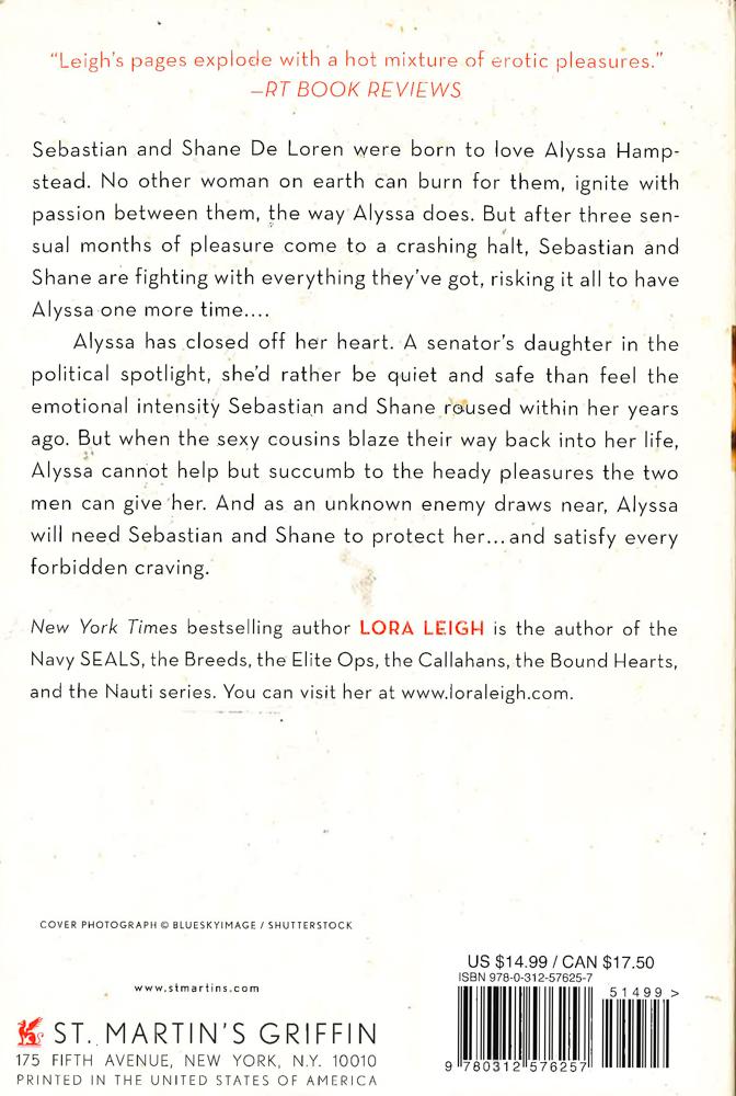 The secret is out: #1 bestselling author Lora Leigh's Bound Hearts series is so hot, it should come with a warning... Sebastian and Shane De Loren were born to love Alyssa Hampstead. No other woman on earth can burn for them, ignite with passion between them, the way Alyssa does. But after three sensual months of pleasure come to a crashing halt, Sebastian and Shane are left fighting with everything they've got, risking it all to have Alyssa one more time... Alyssa has closed off her heart. A senator's daughter in the political spotlight, she'd rather be quiet and safe than feel the emotional intensity Sebastian and Shane roused within her years ago. But when the sexy cousins blaze their way back into her life, Alyssa cannot help but succumb to the heady pleasures the two men can give her. And as an unknown enemy draws near, Alyssa will need Sebastian and Shane to protect her...and satisfy every forbidden craving.