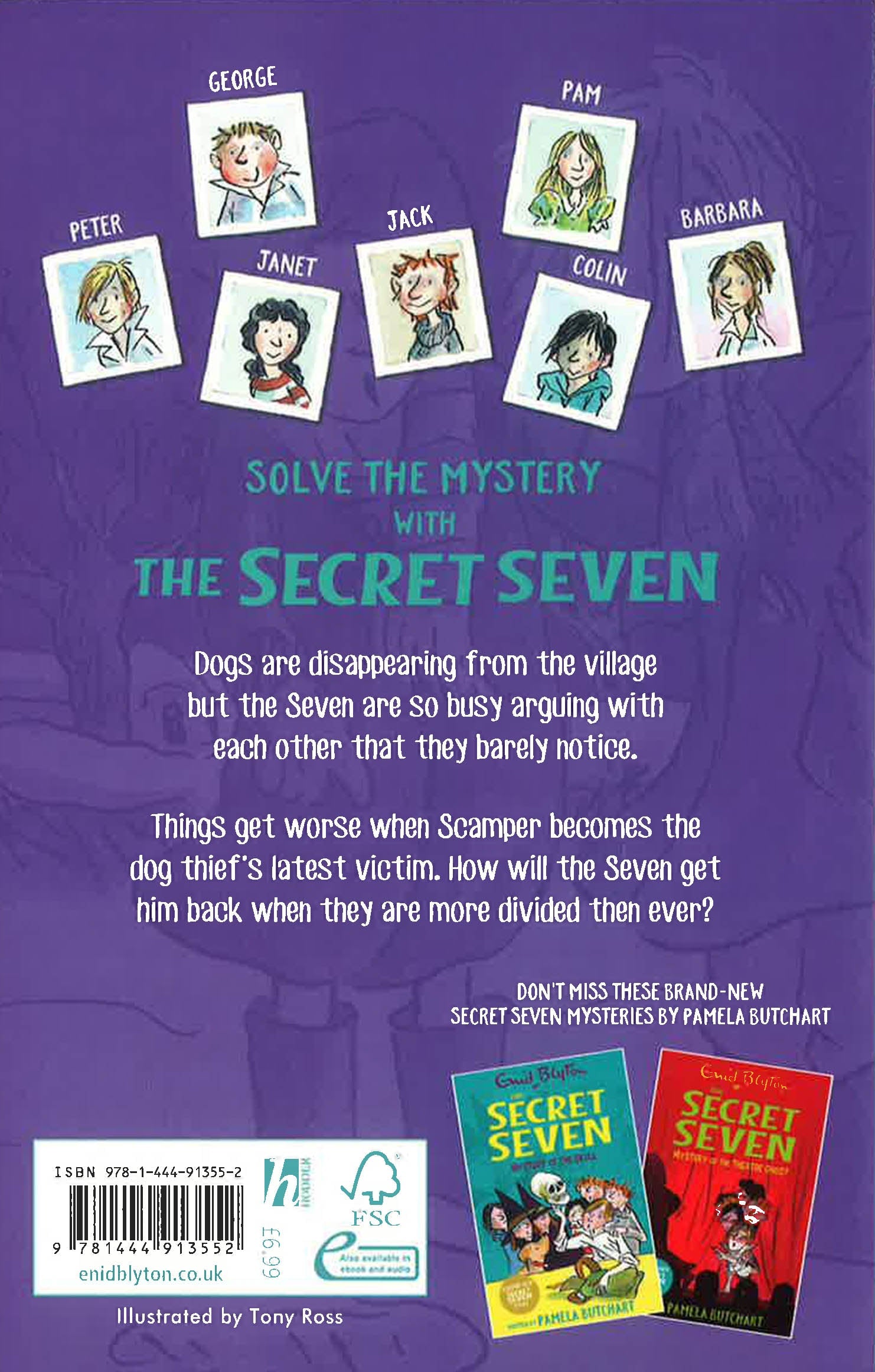 Solve the mystery with the Secret Seven - everyone's favourite detective club! These timeless stories are perfect for young fans of mystery, adventure or detective series. In book thirteen, dogs are disappearing from the village, but the Seven are so busy arguing and falling out with each other that they don't even notice. Then poor Scamper becomes the latest victim and it's all systems go for the Secret Seven!Solve the mystery! Cover and inside illustrations are by the brilliant Tony Ross, illustrator of David Walliams's books. The story was first published in 1961. This edition features the classic text and comes with a Bonus Blyton section at the back with quizzes, puzzles and other bonus extras! Have you read all 15 books in the original Secret Seven series by Enid Blyton? And don't miss these other Secret Seven titles...Mystery of the Skull - a brand-new Secret Seven mystery by prizewinning author Pamela Butchart. Secret Seven Brain Games - a fun and tricky puzzle book ***The Secret Seven (R), Enid Blyton (R) and Enid Blyton's signature are registered trade marks of Hodder & Stoughton Limited. No trade mark or copyrighted material may be reproduced without the express written permission of the trade mark and copyright owner.