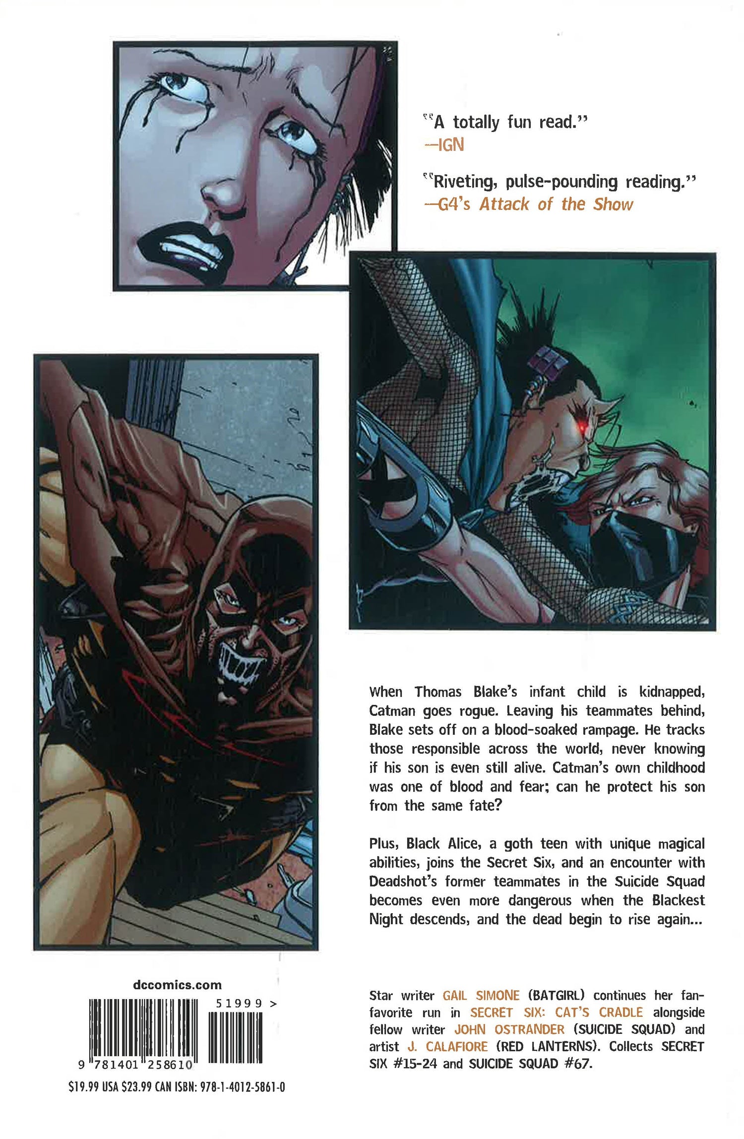 Amanda Waller and her Suicide Squad have captured Deadshot to force him back in their ranks. But his teammates in the Secret Six don't see that happening any time soon. Features a Blackest Night tie-in! Plus, Thomas Blake - a k a Catman - heads to Africa to find the three men who kidnapped his long lost son, while Catman leaves a trail of destruction in his wake that threatens to destroy the Secret Six once and for all. It collects SECRET SIX #15-24 and SUICIDE SQUAD #67.