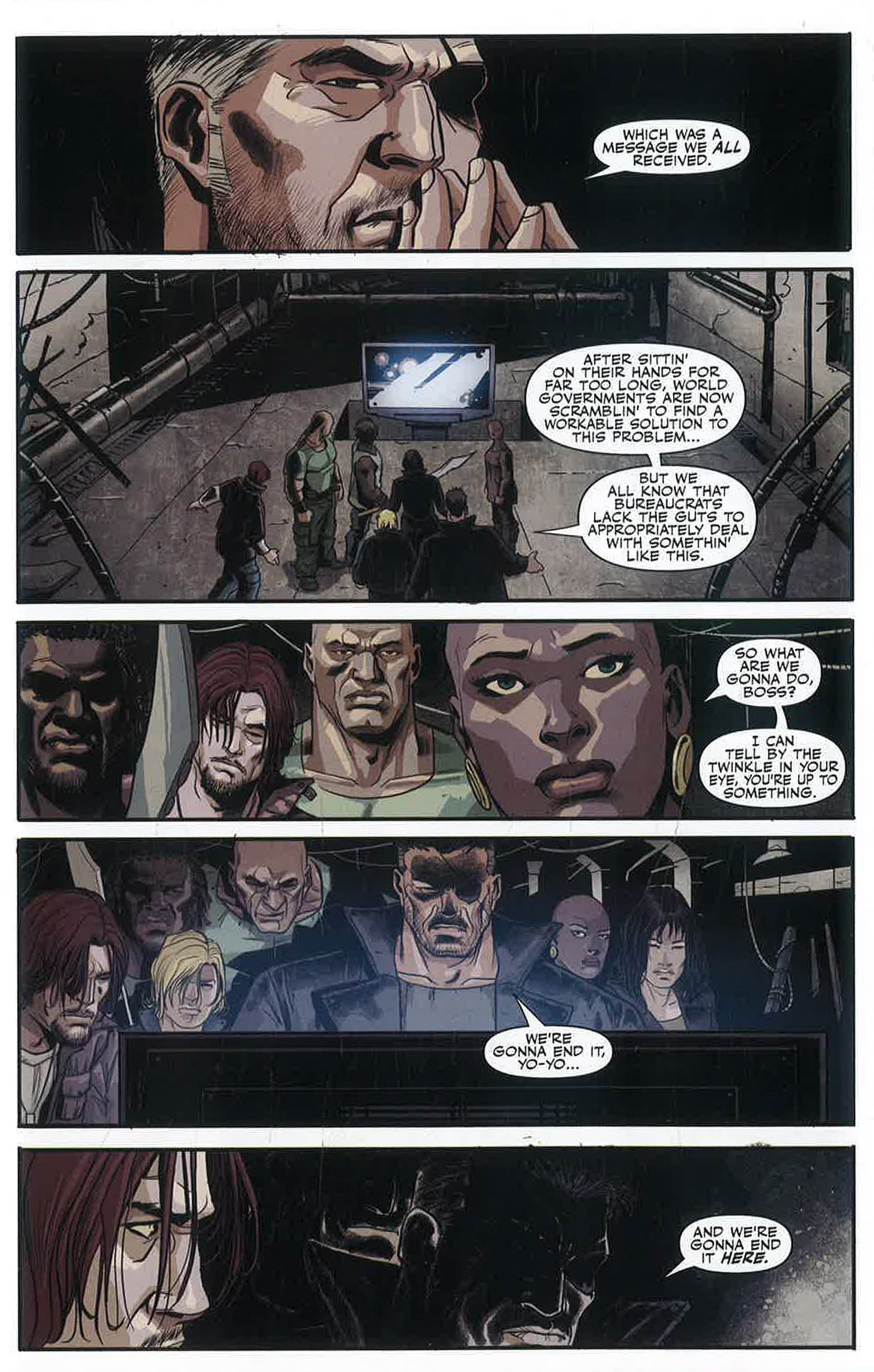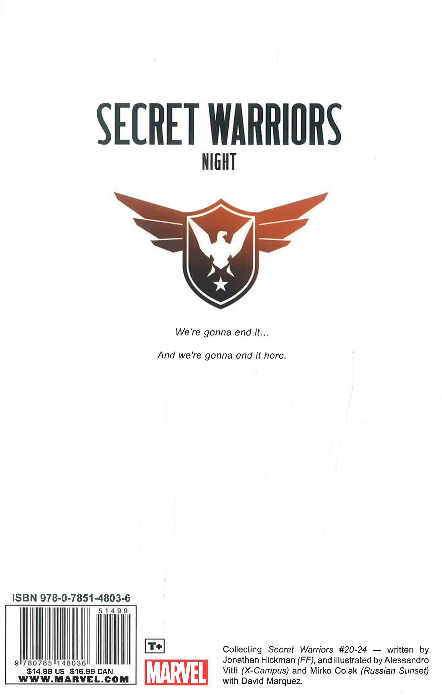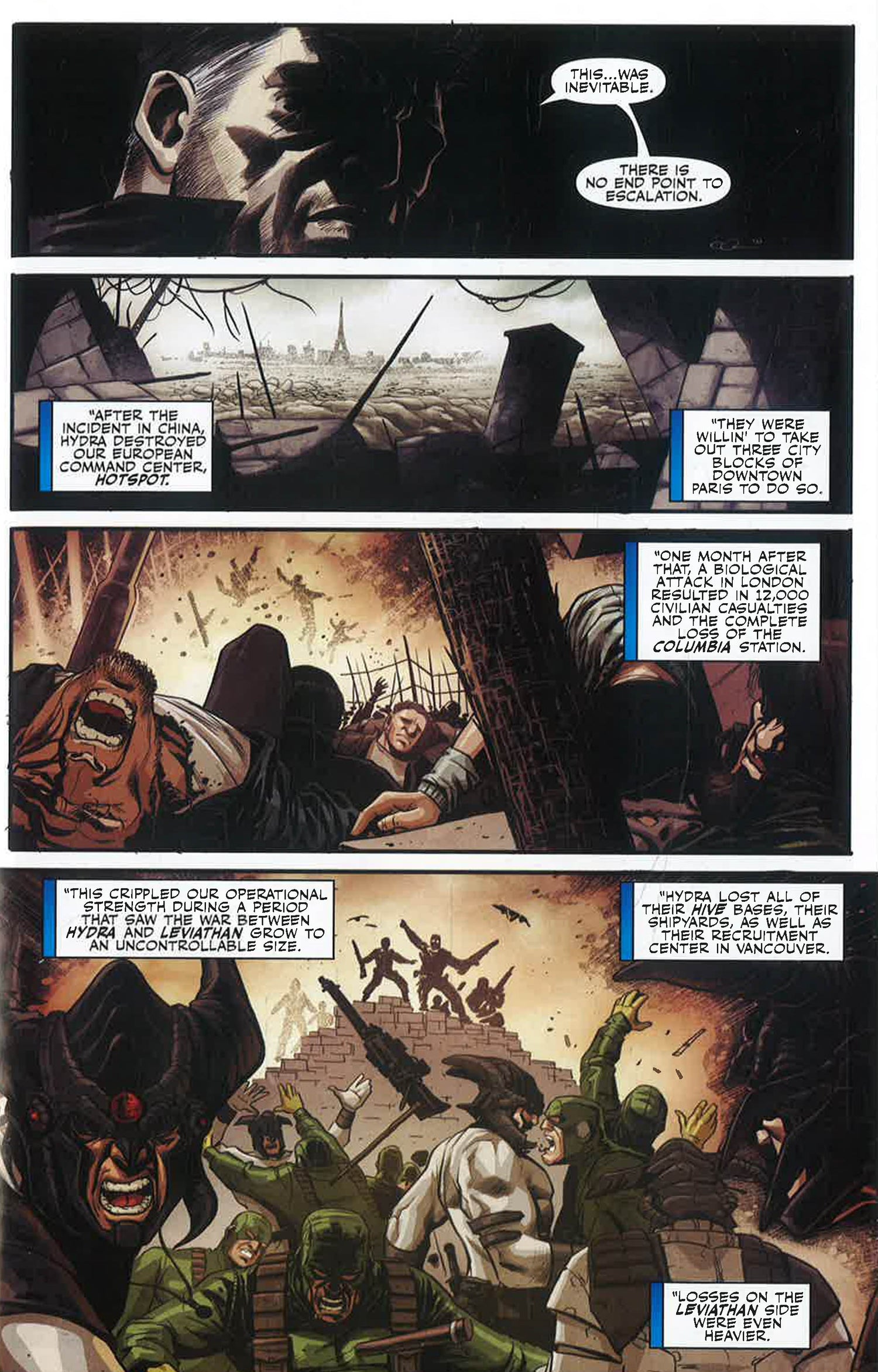 The power struggle between Hydra, Leviathan and Nick Fury has cost each side dearly, forcing Fury to reassess his future following the defeat of the Howling Commandos and the deaths of two of his oldest friends. But with a massive attack on a Seattle Hydra base, Leviathan and Hydra again make war - on each other and the world. As night falls and Seattle explodes, Fury makes some of the grittiest life-and-death choices his Warriors have ever seen. And as the long fight between the Secret Warriors and Hydra draws to its inevitable conclusion, Fury's final wild card is revealed. Who are the members of his third covert team, and what have they been up to all this time? Writer Jonathan Hickman's (FANTASTIC FOUR, S.H.I.E.L.D.) series of intrigue and international espionage builds to a shocking climax with breathtaking action and intense drama.