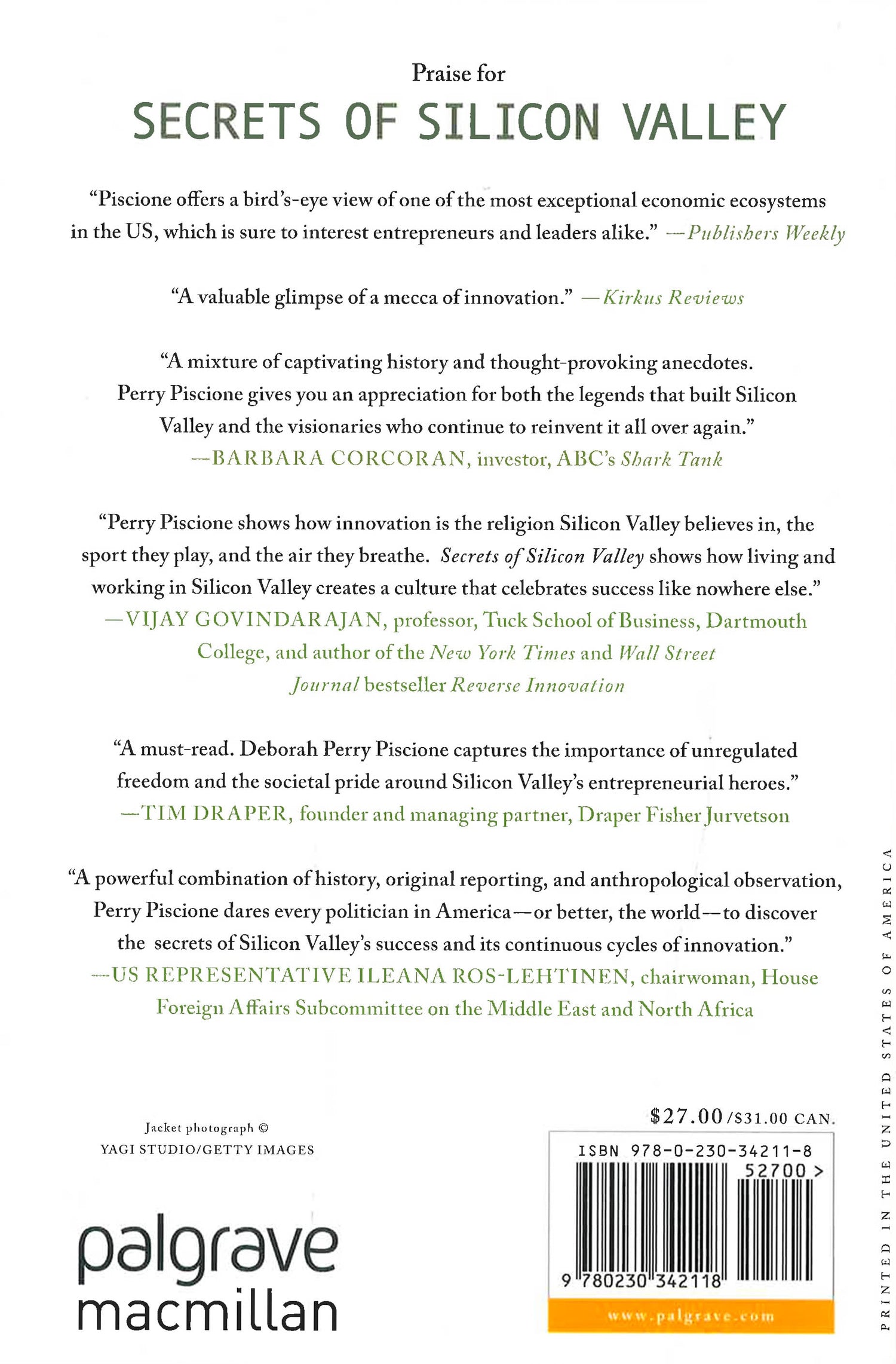 While the global economy languishes, one place just keeps growing despite failing banks, uncertain markets, and high unemployment: Silicon Valley. In the last two years, more than 100 incubators have popped up there, and the number of angel investors has skyrocketed. Today, 40 percent of all venture capital investments in the United States come from Silicon Valley firms, compared to 10 percent from New York.In Secrets of Silicon Valley, entrepreneur and media commentator Deborah Perry Piscione takes us inside this vibrant ecosystem where meritocracy rules the day.She explores Silicon Valley's exceptionally risk-tolerant culture, and why it thrives despite the many laws that make California one of the worst states in the union for business. Drawing on interviews with investors, entrepreneurs, and community leaders, as well as a host of case studies from Google to Tesla to Paypal, Piscione argues that Silicon Valley's unique culture is the best hope for the future of American prosperity and the global business community and offers lessons from the Valley to inspire reform in other communities and industries, from Washington, DC to Wall Street.
