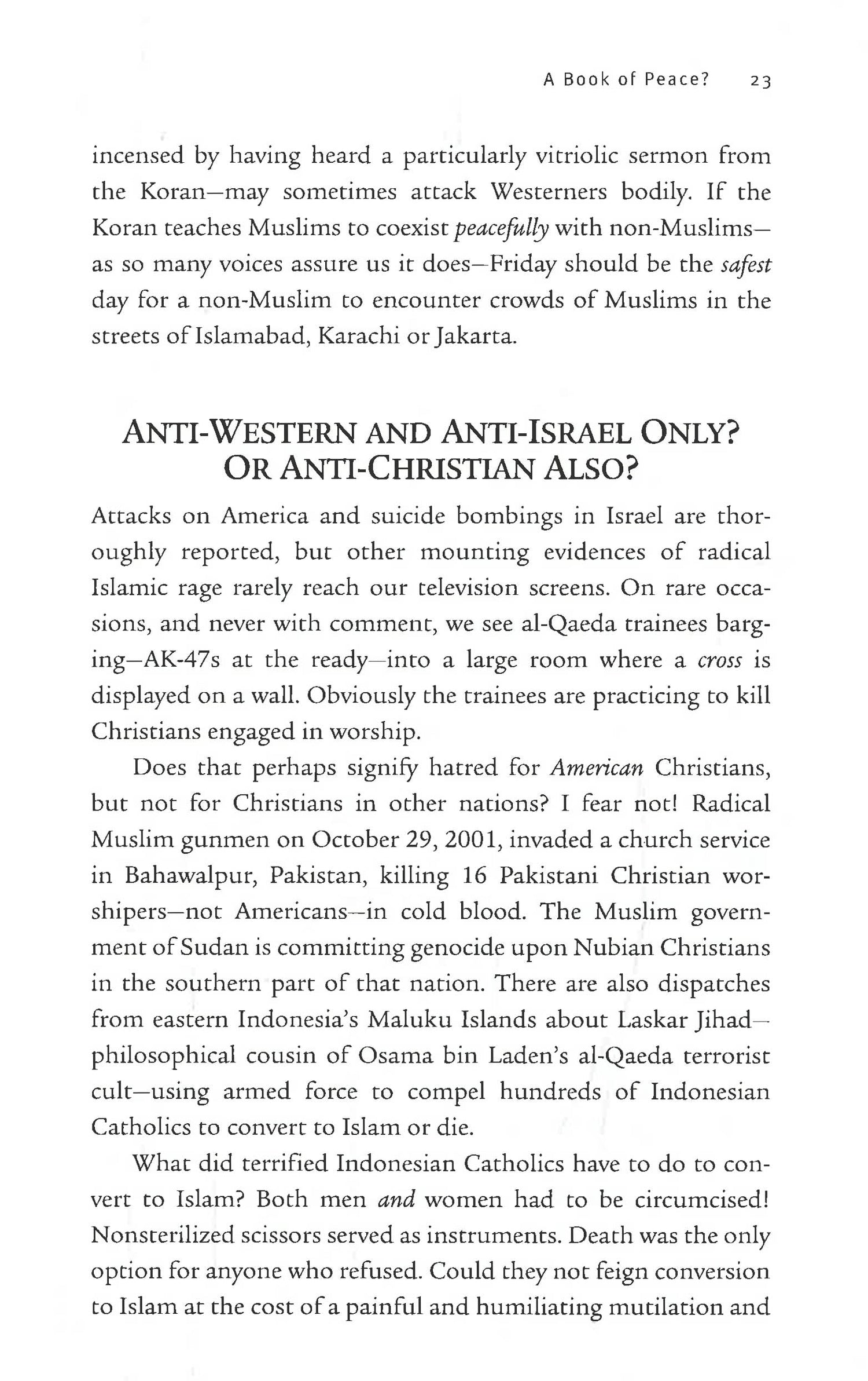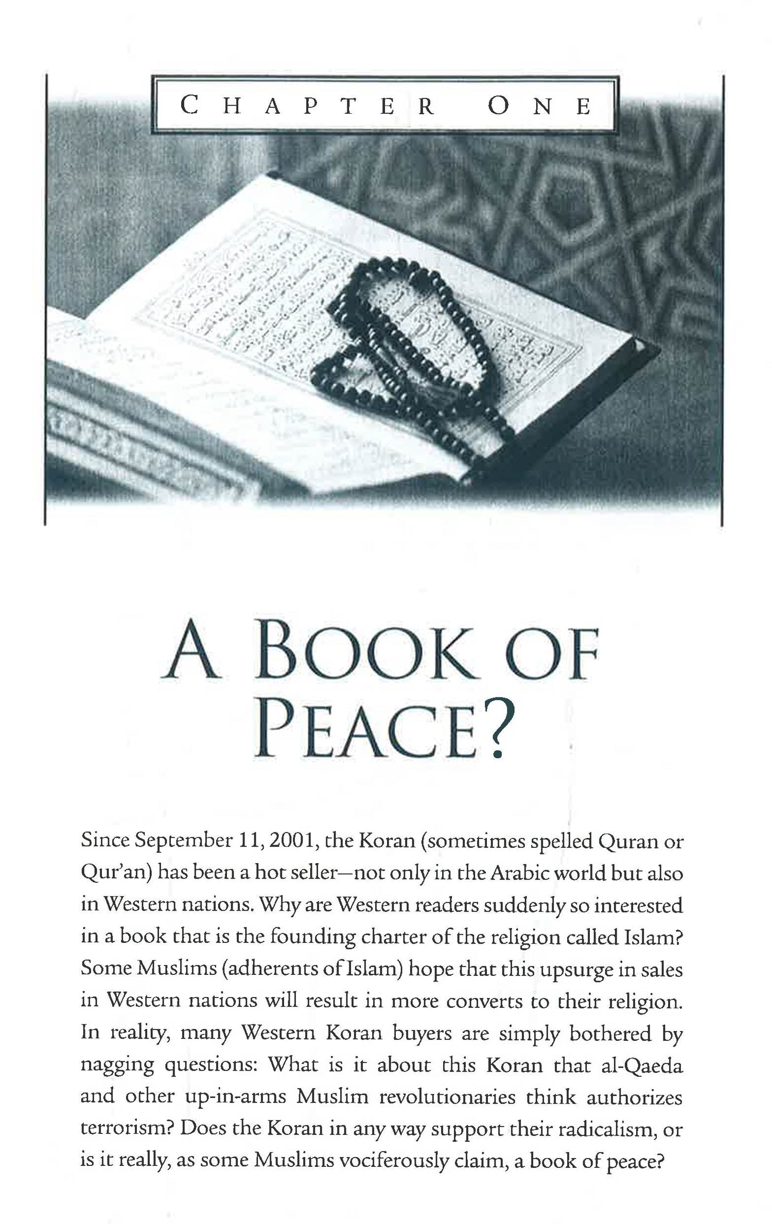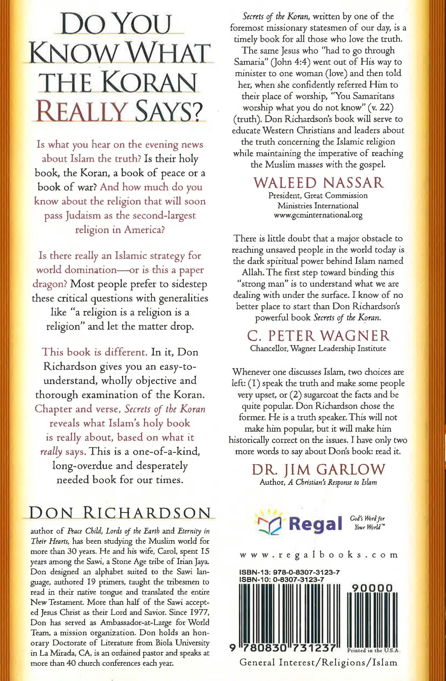 Forget all those evening news sound bites or diplomatically correct half-truths about the Koran and the religion of Islam. If you want to know what the Koran is really about, you have to know what it really says. Don Richardson gives you a nitty-gritty inside look at the Koran, helping to separate fact from fiction. These hard-hitting observations are not the author's opinion based on what he thinks the Koran seems to imply. Muslim boys are indoctrinated in military camps. Madrasa schools force memorization and repetition of the Koran particularly those verses that promise heavenly rewards for martyrdom. It took courage to write this serious, documented and well-sourced book. But the price of truth is courage, regardless of ones religion.