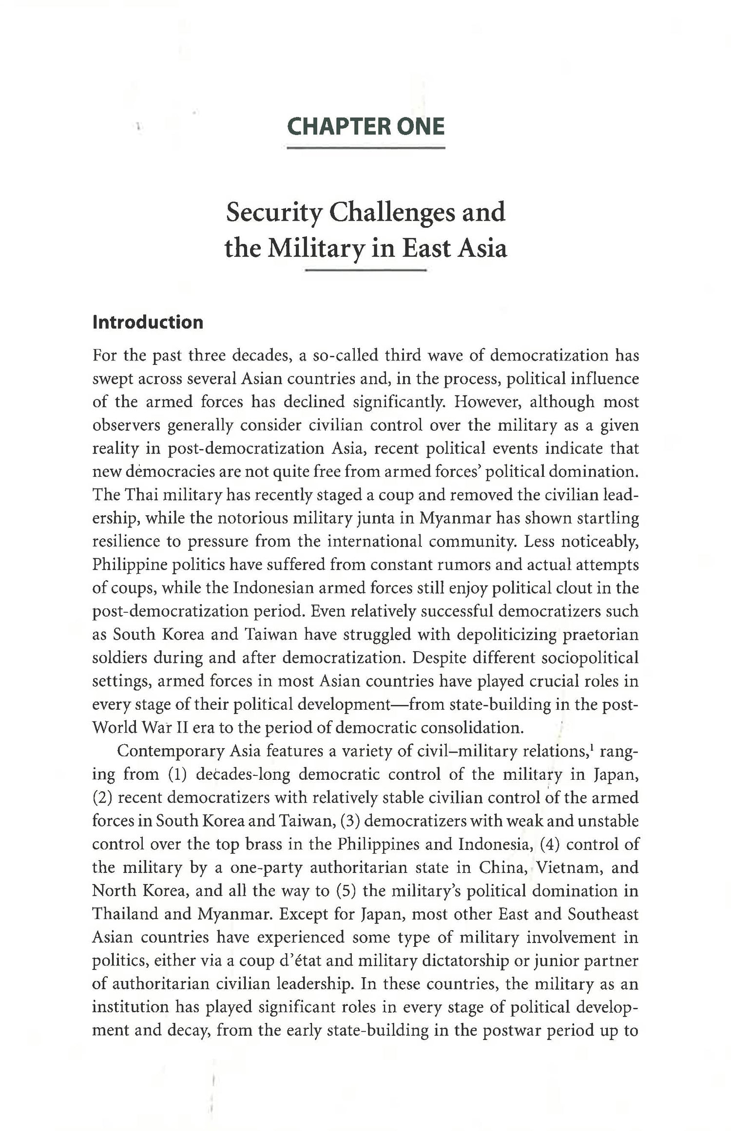 Examines the political role played by armed forces in South Korea, Indonesia, the Philippines, and Taiwan. This work analyzes how security threats have shaped the military's organization, doctrine, and domestic political role at various stages of political development, from the state-building period to today's post-democratization era.This comparative work examines the political role played by armed forces in South Korea, Indonesia, the Philippines, and Taiwan. The work brings together theory and empirical study, analyzing how security threats have shaped the military's organization, doctrine, and domestic political role at various stages of political development, from the state-building period to today's post-democratization era. Using four representative case studies, Woo sets to answer: What determines the armed forces' political influence? How does it affect political development? How do democratically elected leaders establish civilian control over them? The book first looks at how security threats led to military expansion and authoritarianism at the onset of the Cold War. Next, it examines military dictatorial rule, followed by a study of the military's withdrawal process during democratization. Lastly, it focuses on contemporary civil-military dynamics in the four countries, discussing the obstacles faced by civilian authority and what maybe the most desirable model for civil-military relations in post-democratization Asian societies. "Security Challenges and Military Politics in East Asia" will be an essential resource for anyone studying Asian political development, civil-military relations, and comparative democratization.