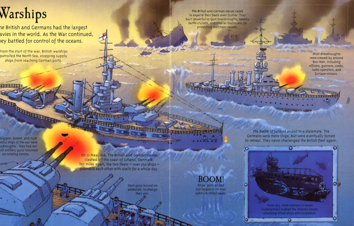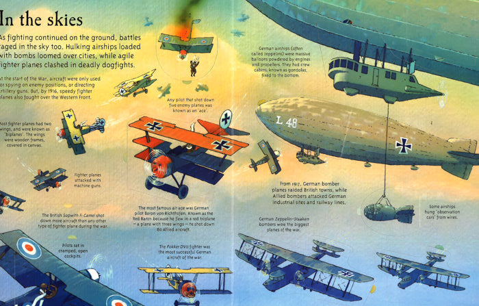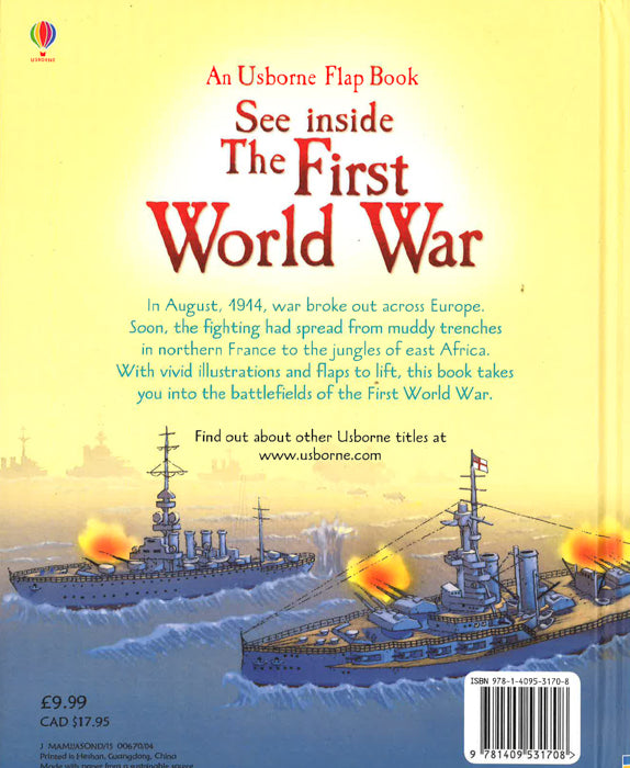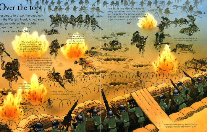 This is a fascinating flap book packed with essential information about the First World War, from the start of the conflict in 1914, to its resolution in 1918. Each of the eight double page spreads have flaps to lift to find out more, allowing the reader to look inside trenches, see an attack across no man's land, see what goes on inside a tank, and how fighter planes defended the skies against airships. Scenes include a battleship fight, the war in the skies, trenches on the Western Front, and a tank battle in no man's land.