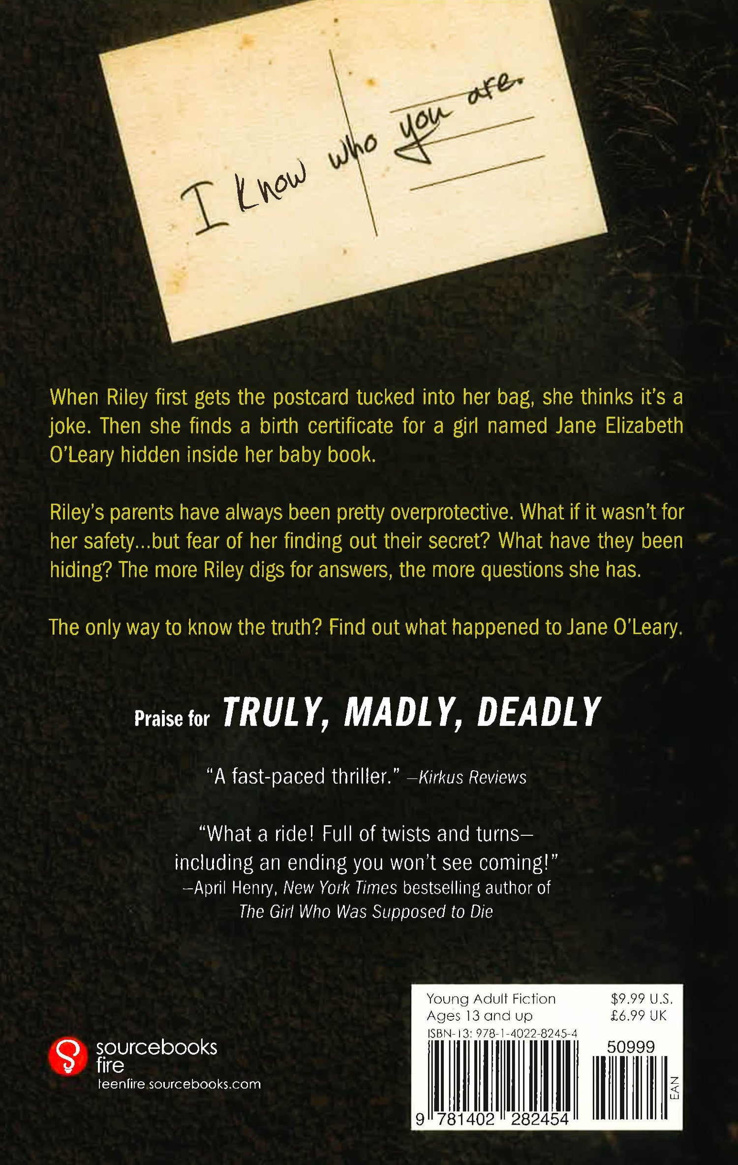 When Riley first gets the postcard tucked into her bag, she thinks it's a joke. Then she finds a birth certificate for a girl named Jane Elizabeth O'Leary hidden inside her baby book.