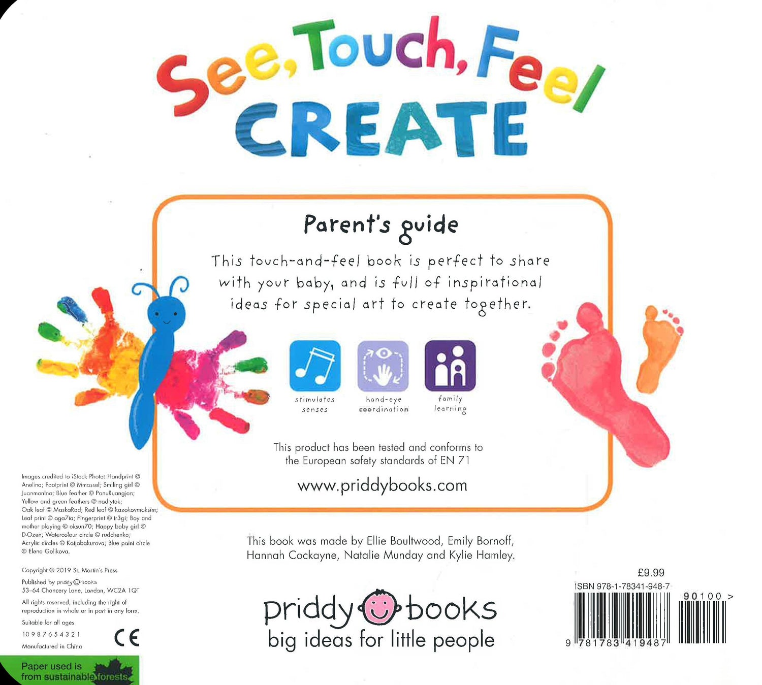 There's lots for babies to explore in See, Touch, Feel: Create. This sturdy board book is specially designed to stimulate babies through creative, sensory play. Each page features artwork created from a fun painting activity, with fingerprints, footprints, and handprints. The embossed, shiny fingerprint artworks mimics the look and feel of real paint, so young children can have all of the fun of messy play without any of the clean-up. Babies will enjoy exploring the charming pictures - a handprint butterfly, a fingerprint caterpillar - which can be used as inspiration for homemade projects and keepsakes.