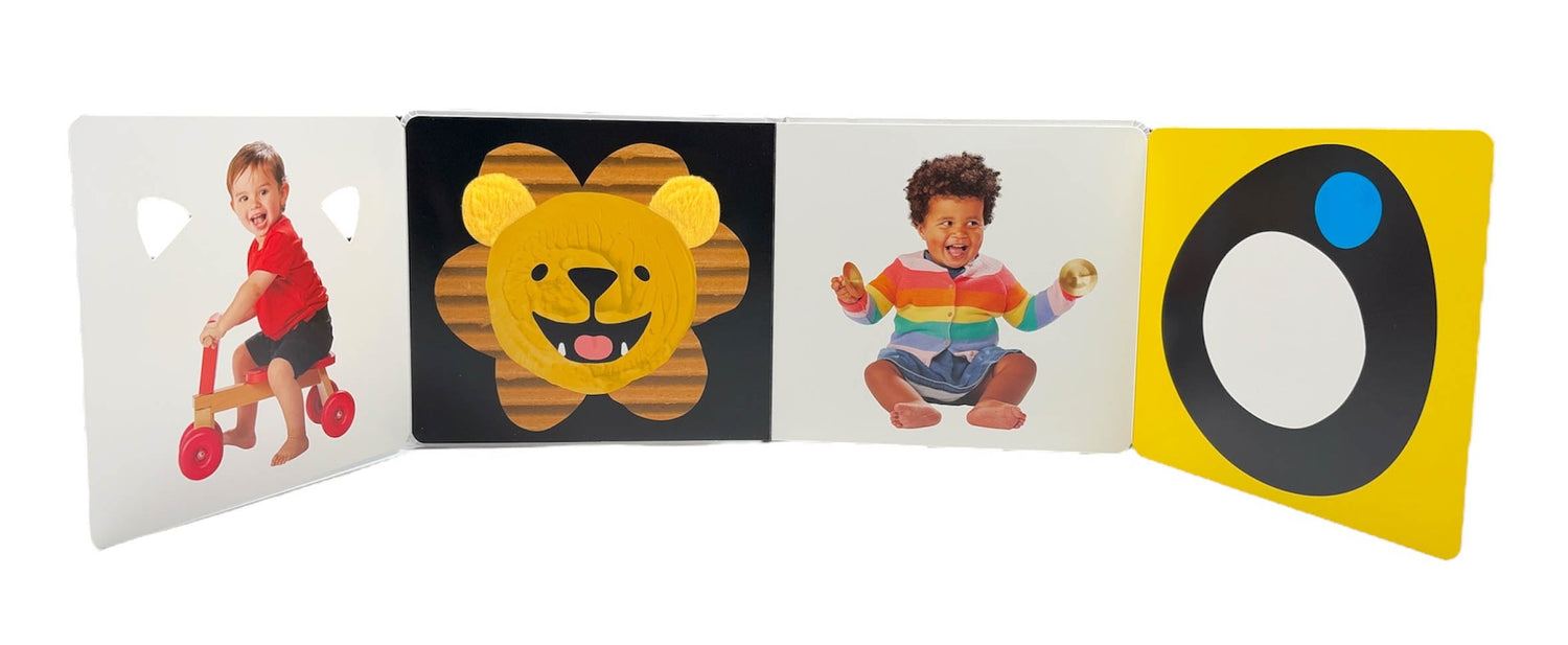This casebound board book features two double page fold-outs so the book can stand up and open out. It was designed this way to be used while babies are lying on their fronts, encouraging them to strengthen their back, arm, and neck muscles as part of their daily tummy time routine.