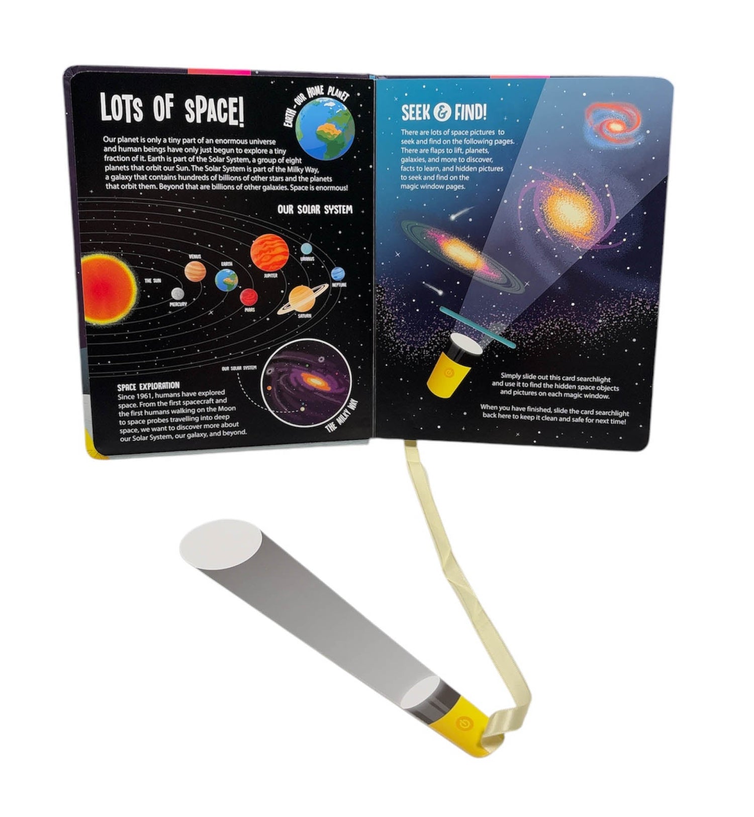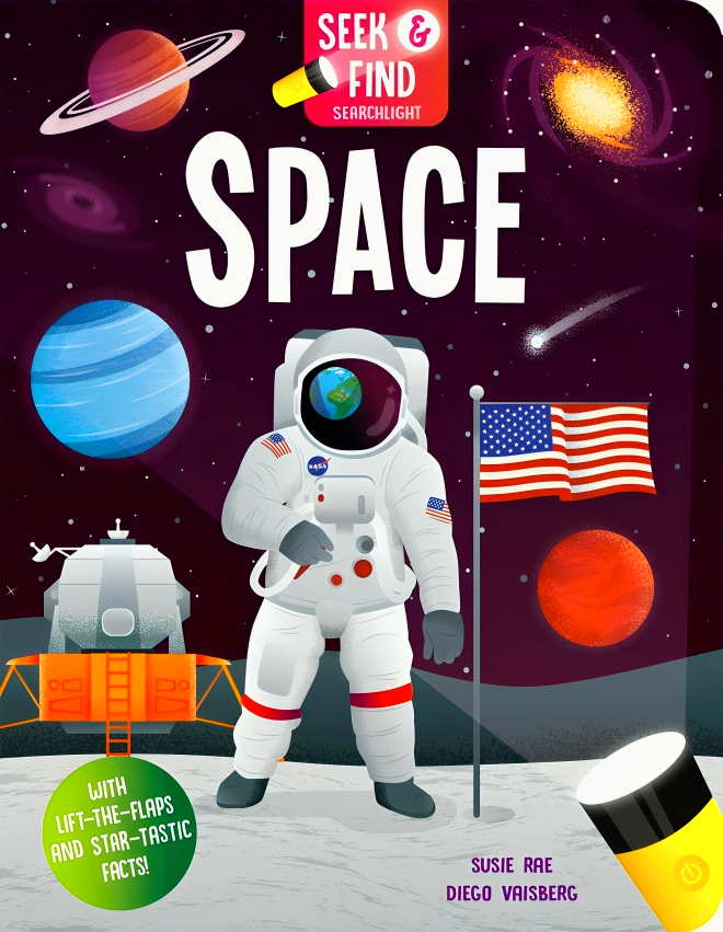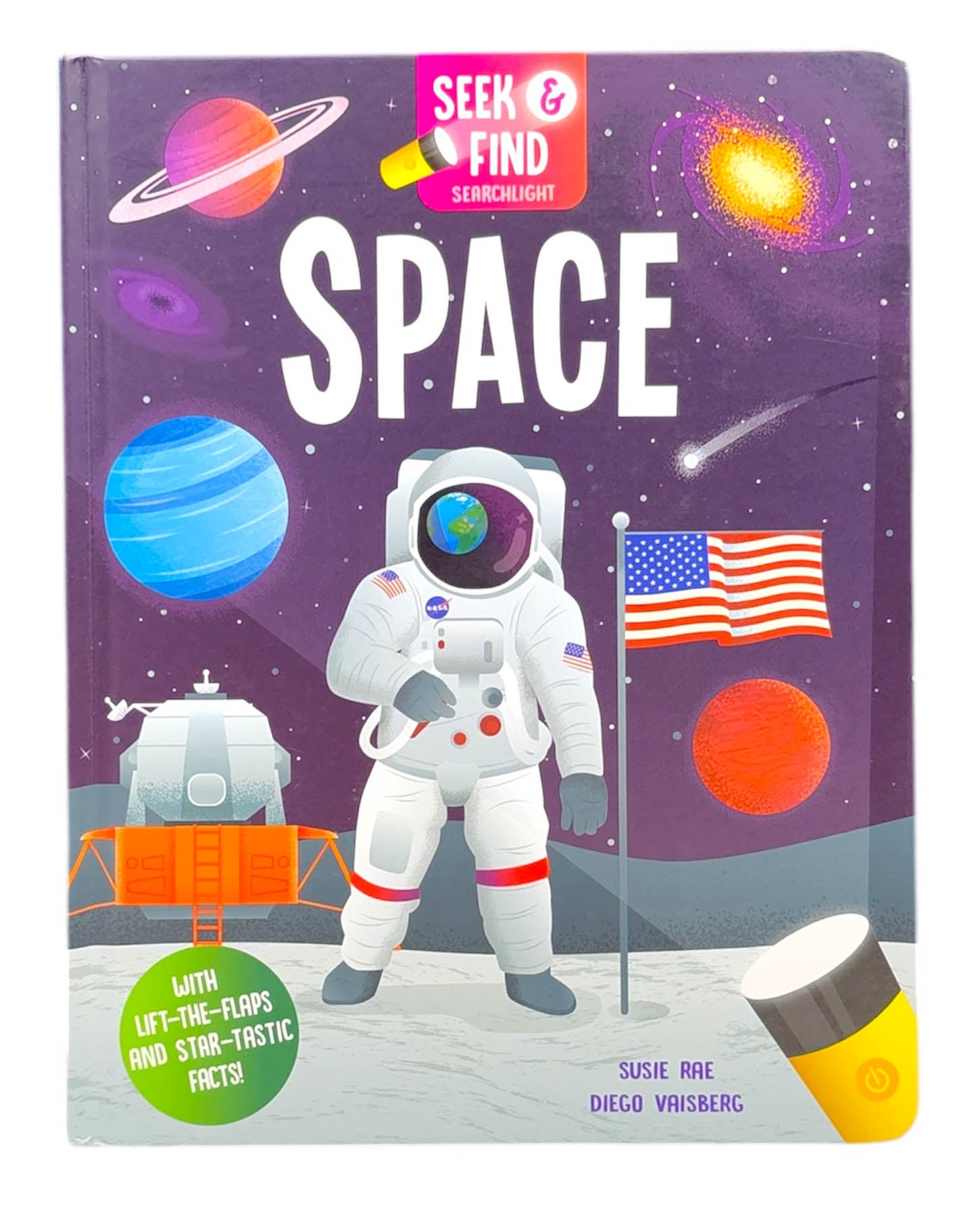Seek and find space pictures by lifting the flaps and using the magic card searchlight to discover hidden pictures and learn hundreds of fascinating facts.