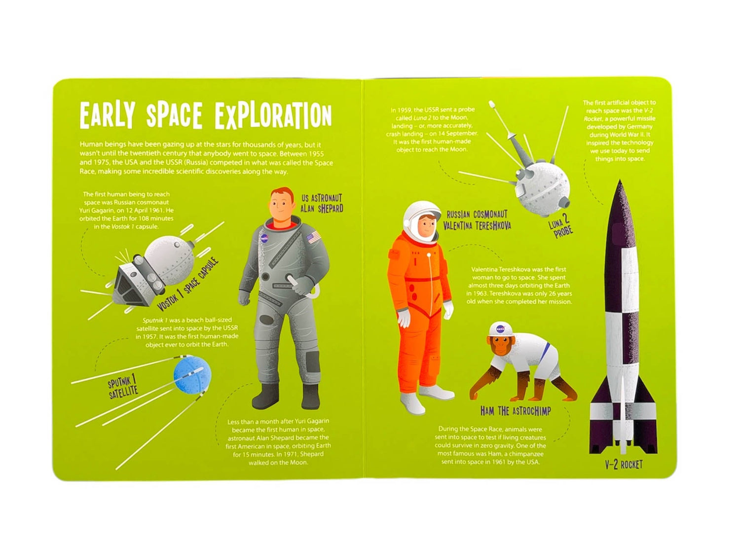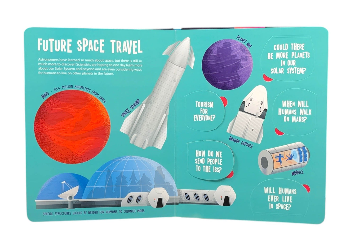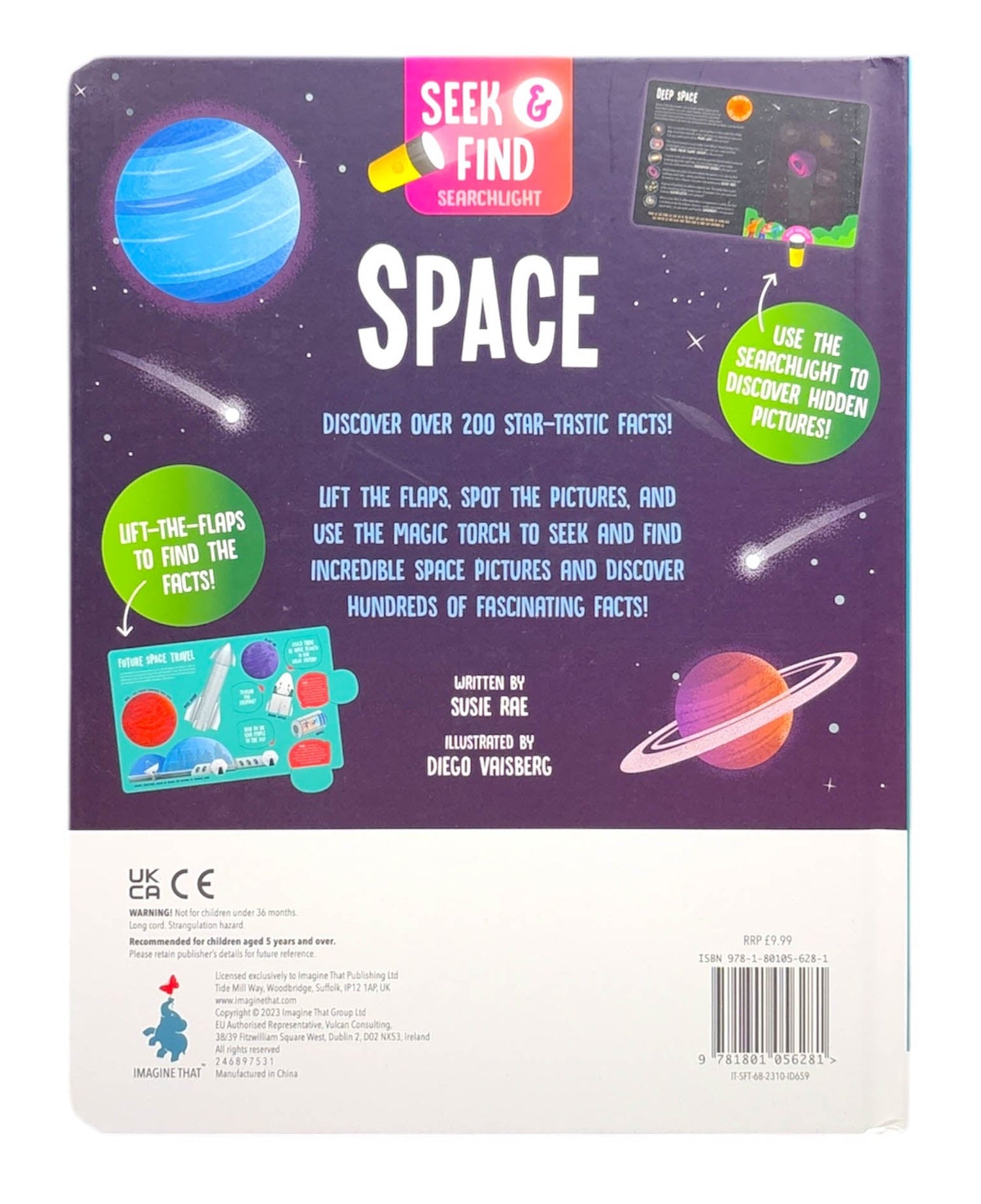 Seek and find space pictures by lifting the flaps and using the magic card searchlight to discover hidden pictures and learn hundreds of fascinating facts.