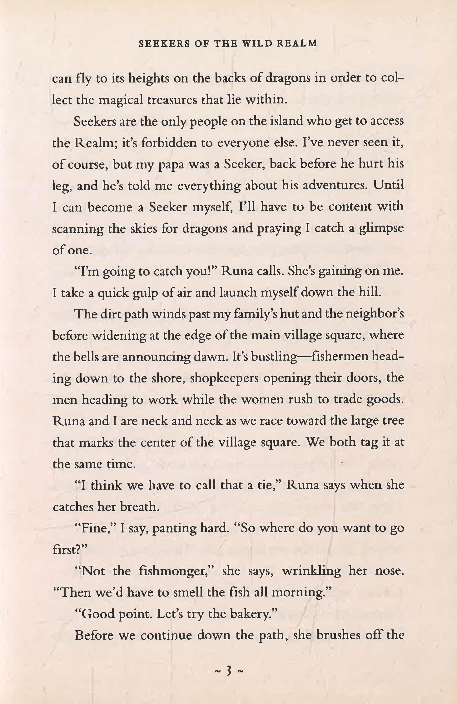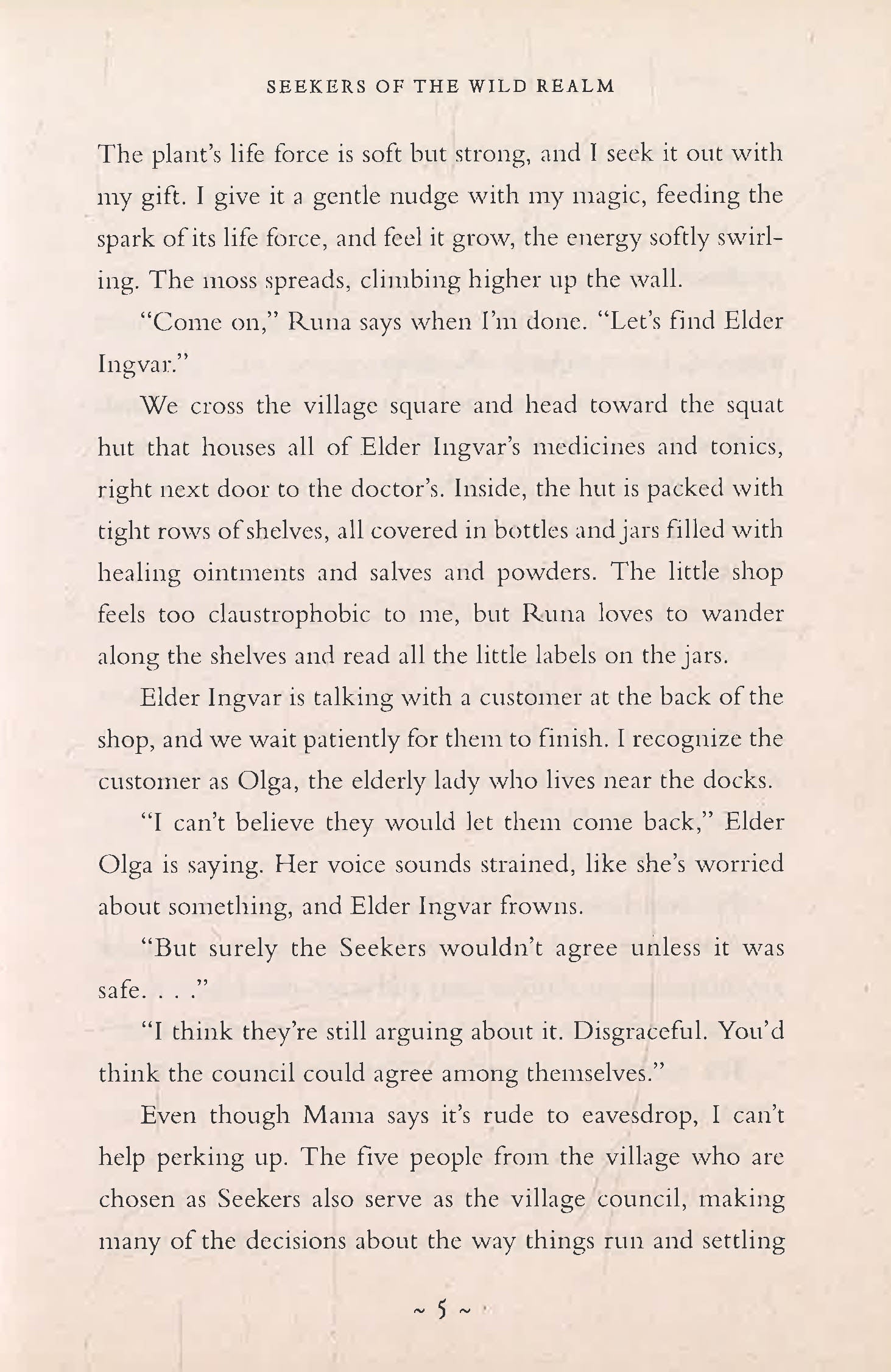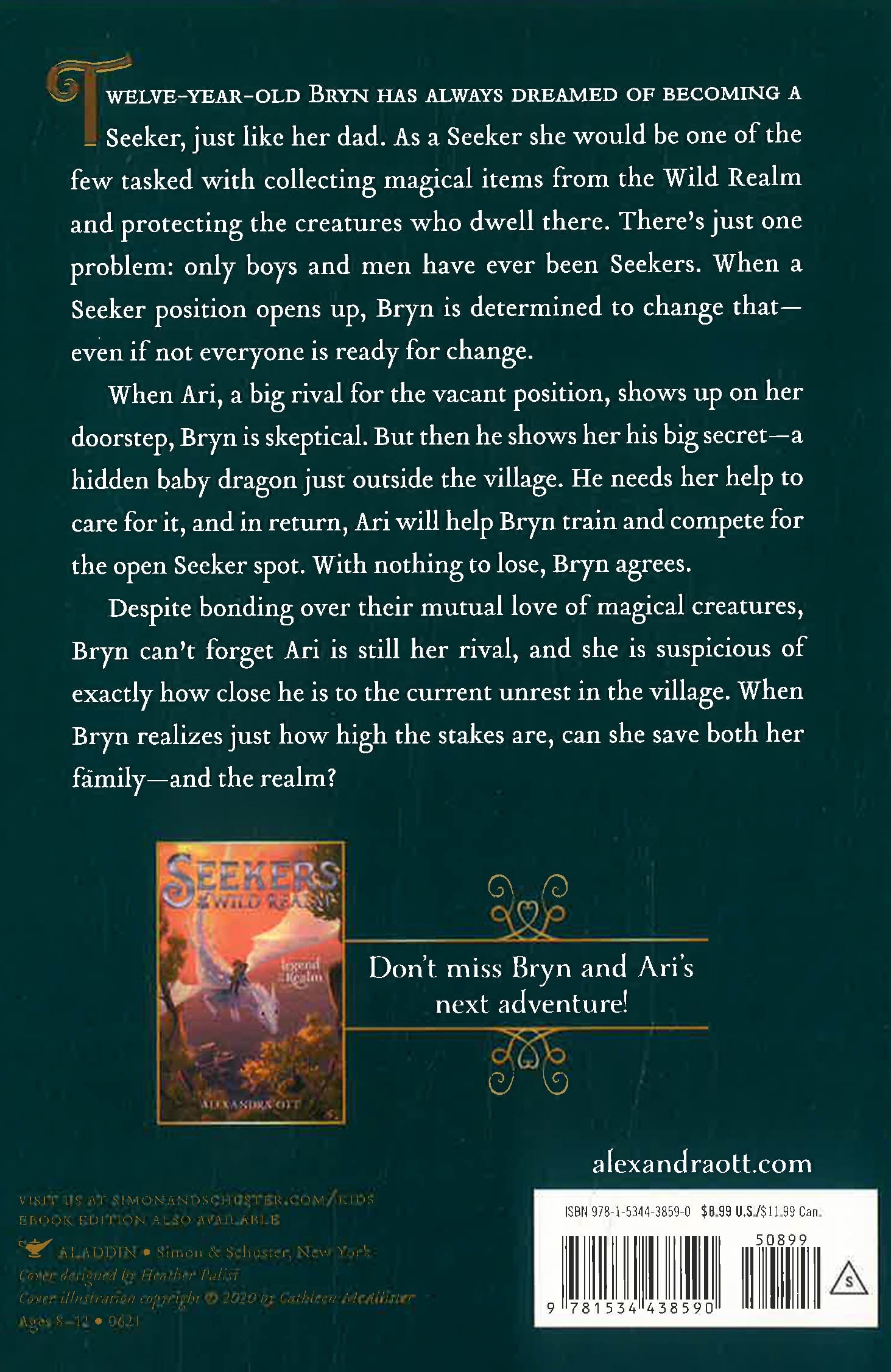 Twelve-year-old Bryn has always dreamed of becoming a Seeker, just like her dad. Only the Seekers are allowed to journey from their small village into the fantastical, untamed wilderness of their island known as the Wild Realm. Once there, they obtain magical items for the village and use magic to protect and heal the incredible creatures native to the Realm.