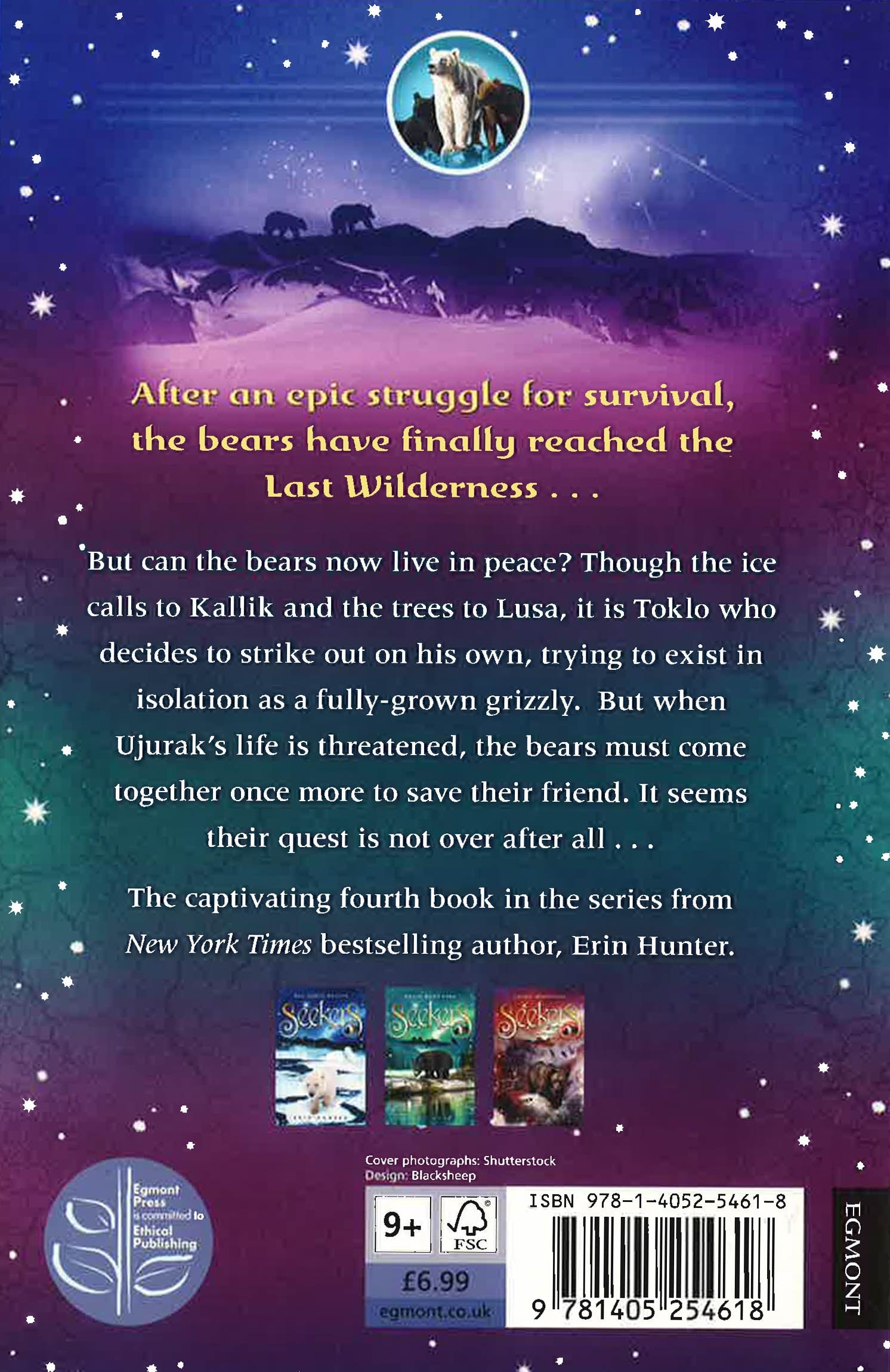 Three bears; one incredible journey to the ends of the Earth. The remarkable follow-up series to the New York Times best-seller, Warriors. After countless trials and an epic struggle for survival, the bears have reached the fabled last great wilderness. Prey is abundant, and people are scarce. Can the bears finally live in peace? Though the ice pulls Kallik, and the trees call to Lusa, it is Toklo who strikes out on his own, trying to exist in isolation as a fully-grown grizzly. But when Ujurak's life is threatened, the bears just come together once more to save their friend. The fourth magical instalment of Erin Hunter's Seekers series. Seekers explores profound environmental themes through the eyes of those suffering at the hands of humans in six epic fantasy books. Animal stories for both boys and girls touching on the wonder, savagery and fragility of the natural world.
