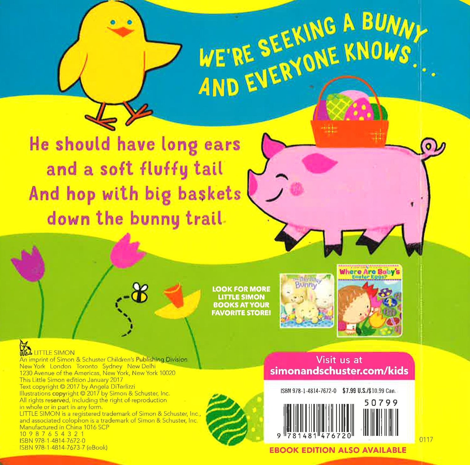 From bestselling author Angela DiTerlizzi comes a lighthearted Easter board book perfect for Easter bunny fans everywhere! I'm seeking a bunny And everyone knows... You should have long ears And a big fluffy tail And hop with big baskets Down the bunny trail. When animal helpers go on a hoppity hunt for the Easter bunny, they come across festive Easter egg clues before finding the perfect Easter surprise!