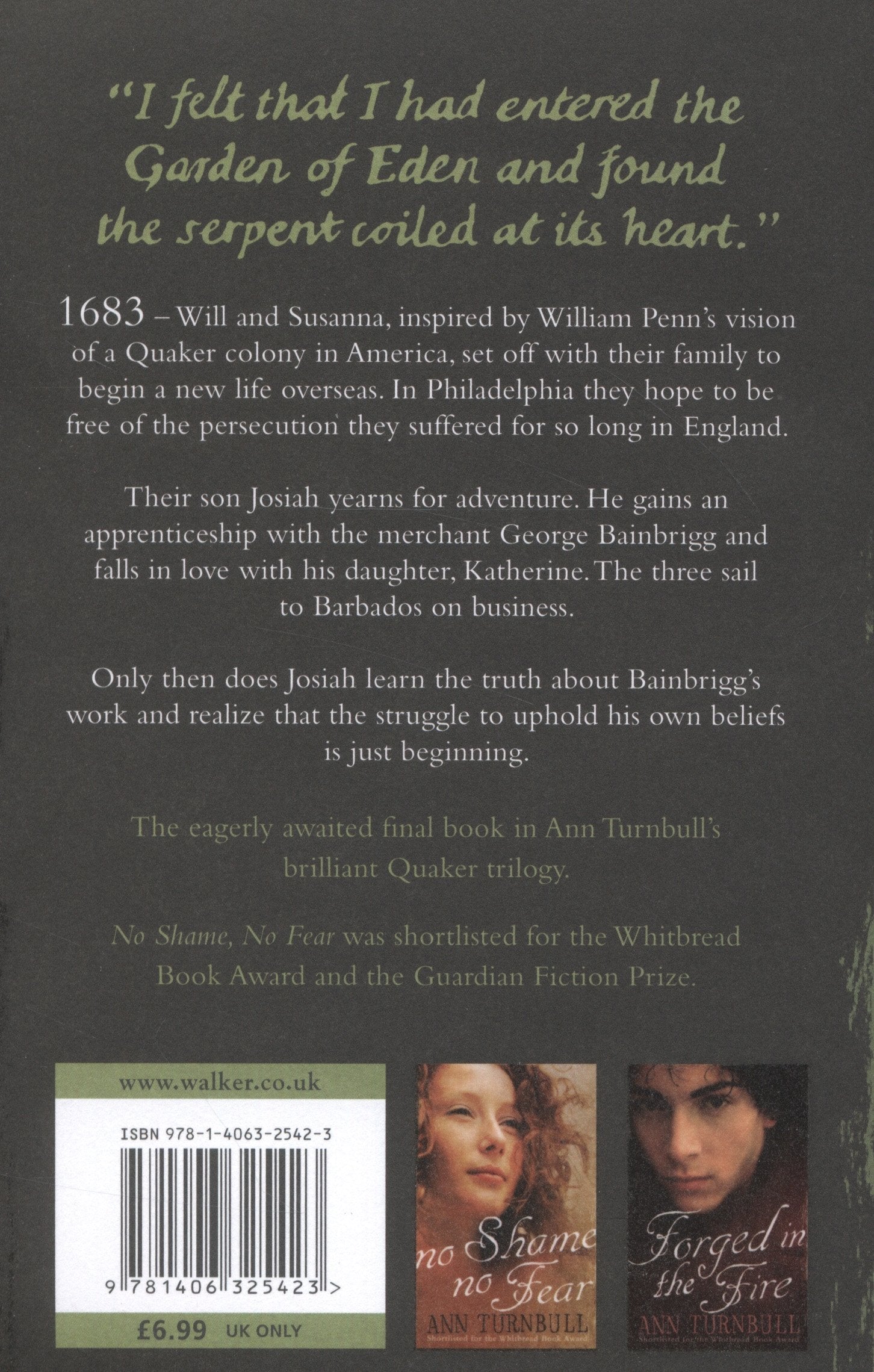 Seeking Eden is the final chapter of Ann Turnbull's long-awaited Quaker trilogy. Will and Susanna Heywood (No Shame, No Fear and Forged in the Fire), now in their thirties, move, with their four children, to Pennsylvania, where freedom of religious thought is everyone's right. This is the story of their eldest child, Josiah, who finds work with George Bainbrigg in the dock area of Philadelphia and falls in love with his daughter, Kate. When they travel to Barbados on business and stay with Friends who are harassed by local laws, Josiah is shocked to learn that Quakers have slaves and that his boss deals in the slave trade. Once they return home, Josiah and Kate try to help two slaves who are in love, Antony and Patience, to attain their freedom - knowing the risks involved may result in lives that are even more unbearable.