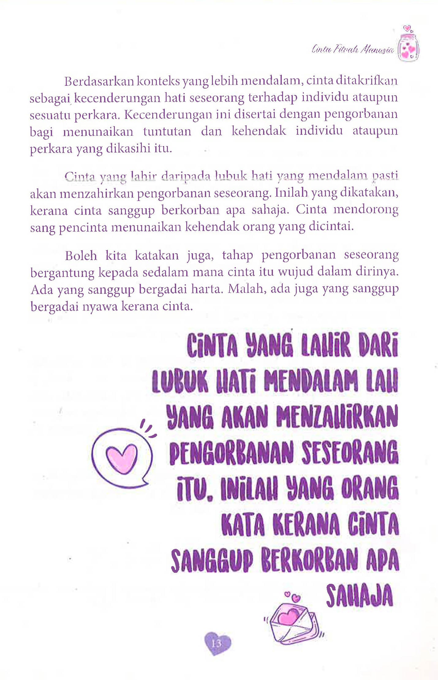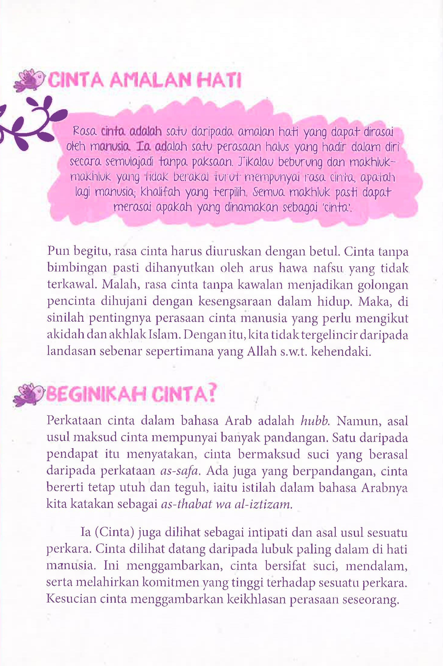 Manusia mampu bahagia dengan cinta. Begitu juga sebaliknya; manusia juga menderita disebabkan cinta. Sama ada dalam konteks individu, keluarga, dan masyarakat sehinggalah dalam konteks cinta manusia kepada Allah s.w.t. Kupasan konsep dan amalan cinta daripada pelbagai perspektif dapat memberi pengetahuan dan panduan kepada setiap individu pada hari ini bagi menangani masalah perpecahan dalam keluarga, keruntuhan akhlak dalam kalangan generasi muda, serta ketandusan kasih sayang dan cinta dalam pelbagai konteks.