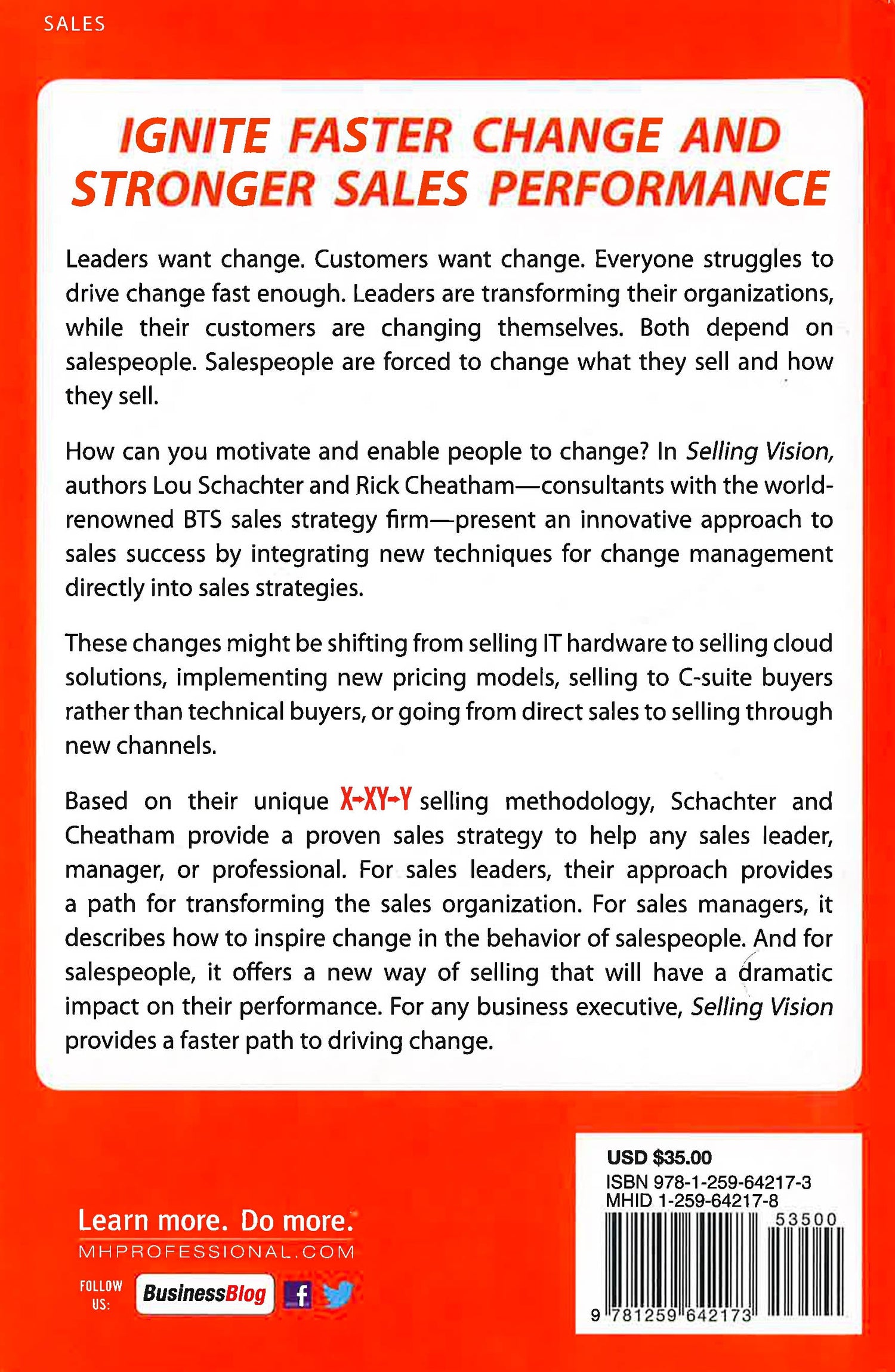 A groundbreaking approach to selling in a world demanding change Leaders, sales managers and professionals have found themselves stuck at a crossroads between the past and the future of selling, and they need a roadmap to help them embrace the challenges they face at such a critical juncture. Selling Vision is a step-by-step guide to creating and selling change. By implementing new change management strategies into their unique X XY Y selling methodology, the authors: * Propose a new logic for thinking about and executing major sales transformations * Examine these transformations from the customer's perspective and how their changing buying patterns suggest a particular way of focusing selling activities * Consider the perspective of salespeople and what they can do to sell change to their customers * Look at how sales leaders and managers can change the way their organizations sell products or services* Highlight the pivotal moments that determine the success of major change initiatives Based on their unique X XY Y selling methodology, Schachter and Cheatham provide a proven sales strategy to help any sales leader, manager, or professional. For sales leaders, their approach provides a path for transforming the sales organization. For sales managers, it describes how to inspire change in the behavior of salespeople. And for salespeople, it offers a new way of selling that will have a dramatic impact on their performance. For any business executive, Selling Vision provides a faster path to driving change. This book provides immediate actions you can take and experiments you can conduct to find the right direction for future sales efforts at any level of an organization. How you respond to changing sales dynamics will determine your company's success, that of your customers, and, to a great extent, your own personal career goals and future.