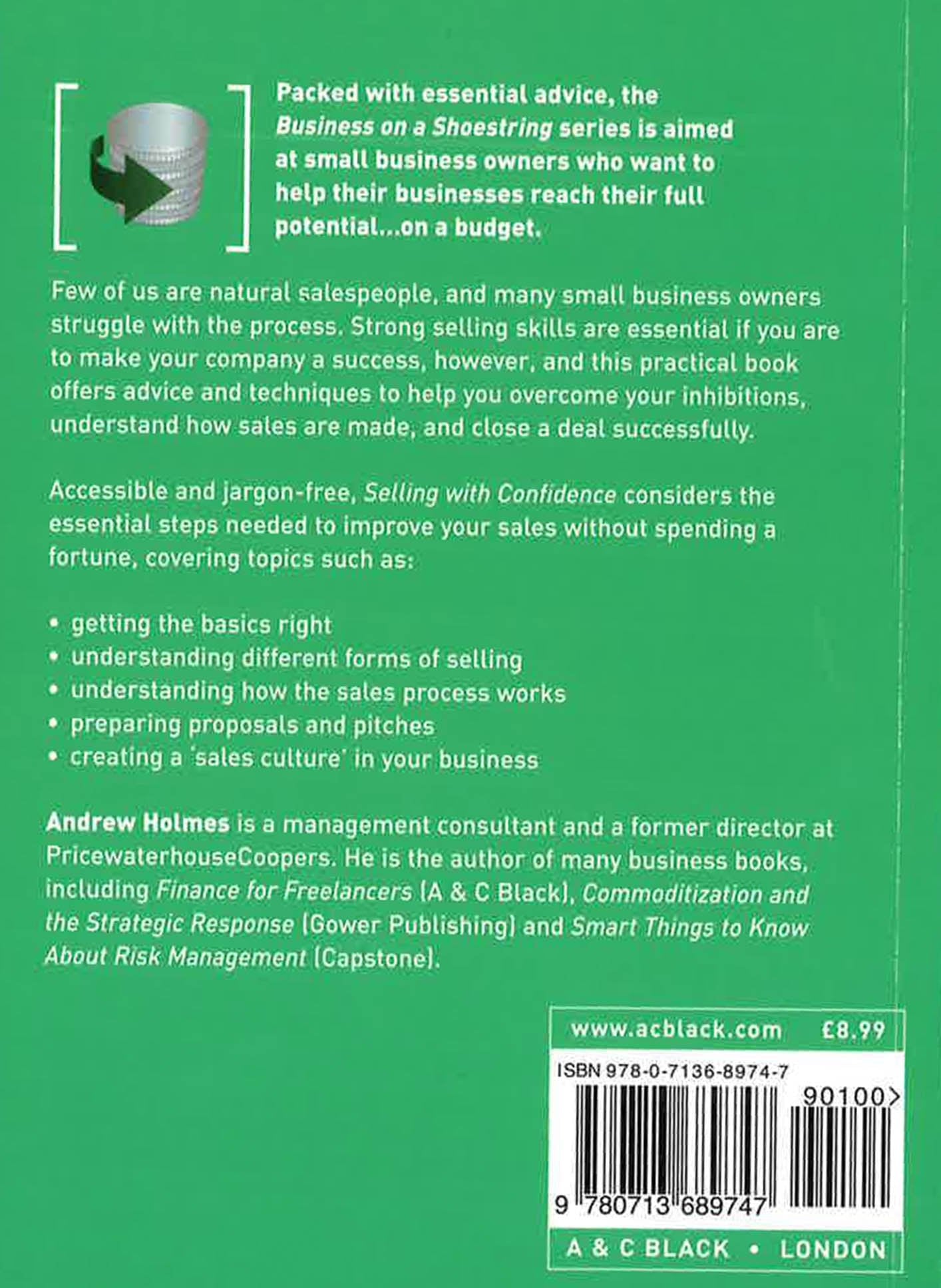 The Business on a Shoestring series helps small business owners grow their business imaginatively, effectively and without spending a fortune. Aimed at entrepreneurs with plenty of vision and commitment but not a lot of cash, each book is packed with ideas that really work, real-life examples, step-by-step advice and sources of further information. Few of us are natural salespeople, and many small business owners struggle with the process. Strong selling skills are essential if you are to make your company a success, however, and this practical book offers advice and techniques to help you overcome your inhibitions, understand how sales are made, and close a deal successfully. Accessible and jargon-free, Selling with confidence looks at the following essential steps - none of which will cost you a fortune: getting the basics right understanding different forms of selling understanding how the sales process works preparing proposals and pitches creating a 'sales culture' in your business
