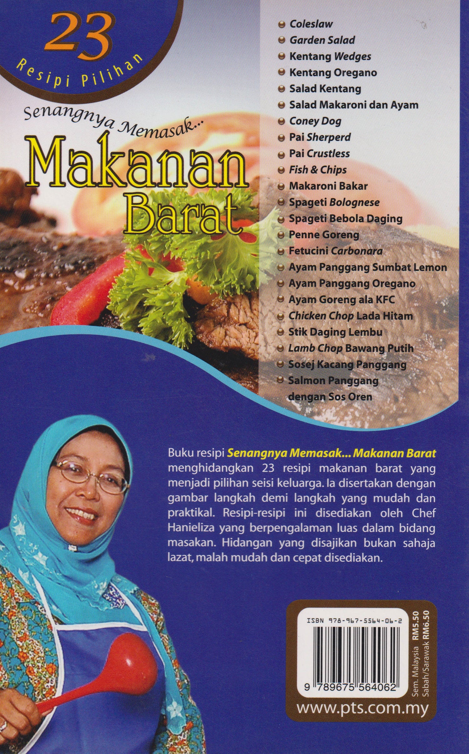 Buku resipi ini menghidangkan 23 resipi makanan barat yang menjadi pilihan seisi keluarga. Ia disertakan dengan gambar langkah demi langkah yang mudah dan praktikal. Resipi-resipi ini disediakan oleh Chef Hanieliza yang berpengalaman luas dalam bidang masakan. Hidangan yang disajikan bukan sahaja lazat, malah mudah dan cepat disediakan.