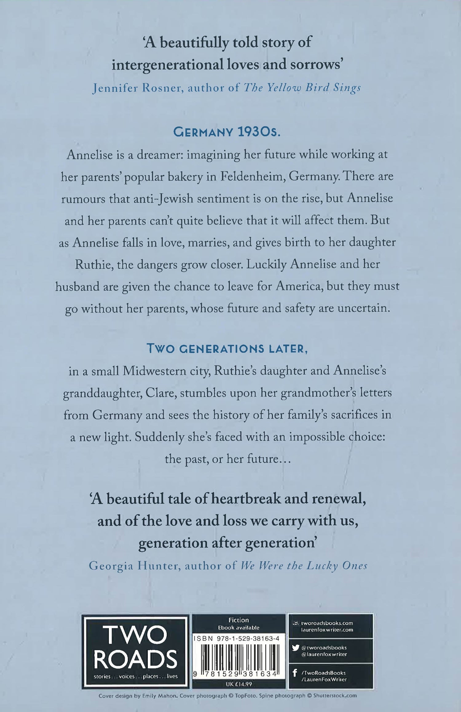 Germany 1930s. Annelise is a dreamer: imagining her future while working at her parents' popular bakery in Feldenheim, Germany, anticipating all the delicious possibilities yet to come. There are rumours that anti-Jewish sentiment is on the rise, but Annelise and her parents can't quite believe that it will affect them; they're hardly religious at all. But as Annelise falls in love, marries, and gives birth to her daughter Ruthie, the dangers grow closer: a brick thrown through her window; a childhood friend who cuts ties with her; customers refusing to patronise the bakery. Luckily Annelise and her husband are given the chance to leave for America, but they must go without her parents, whose future and safety are uncertain. Two generations later, in a small Midwestern city, Ruthie's daughter and Annelise's granddaughter, Clare, is a young woman newly in love. But when she stumbles upon her grandmother's letters from Germany, she sees the history of her family's sacrifices in a new light, and suddenly she's faced with an impossible choice: the past, or her future. A novel of dazzling emotional richness that is based on letters from Lauren Fox's own family, Send for Me is an epic and intimate exploration of mothers and daughters, duty and obligation, hope and forgiveness.