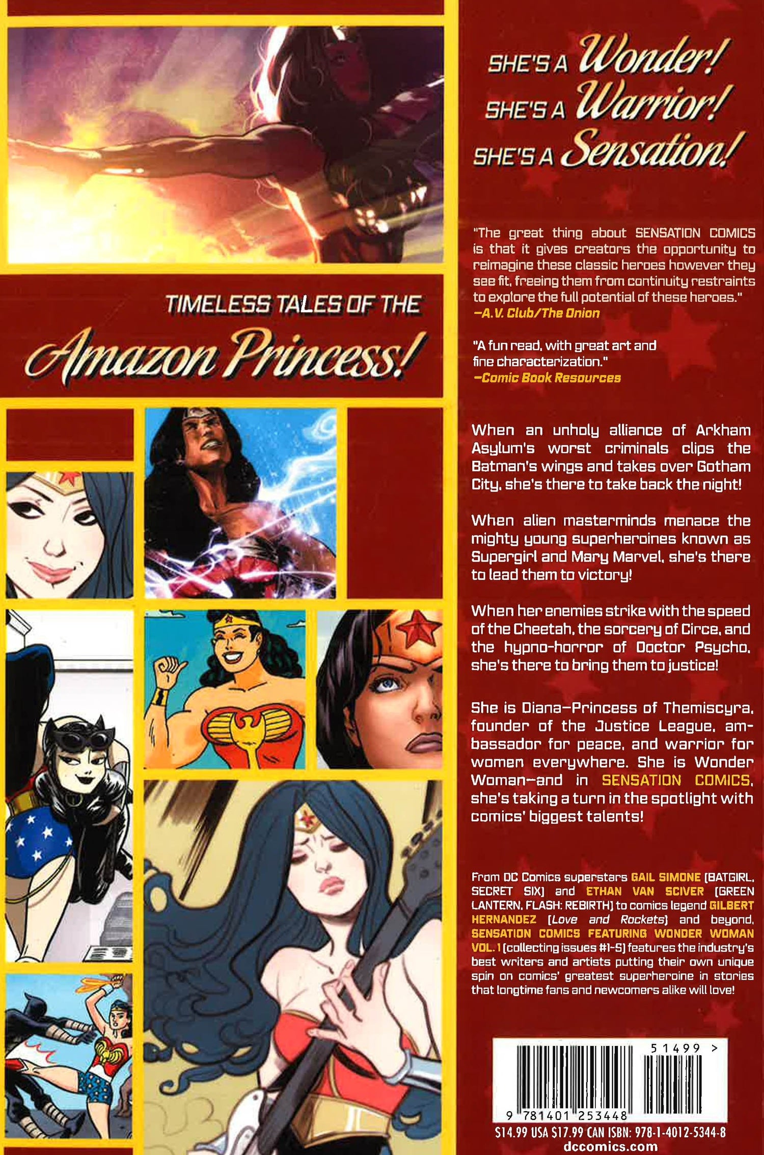 Wonder Woman stars in her first digital-first anthology series!Gail Simone and Ethan Van Sciver kick things off when Oracle calls for help after the entire Bat-Family gets sidelined. But when Wonder Woman steps into the breach, Gotham City's criminals get the surprise of their lives! Then, Amanda Deibert and Cat Staggs take Diana to school, where she meets her biggest fan! Collects Sensation Comics featuring Wonder Woman #1-5.