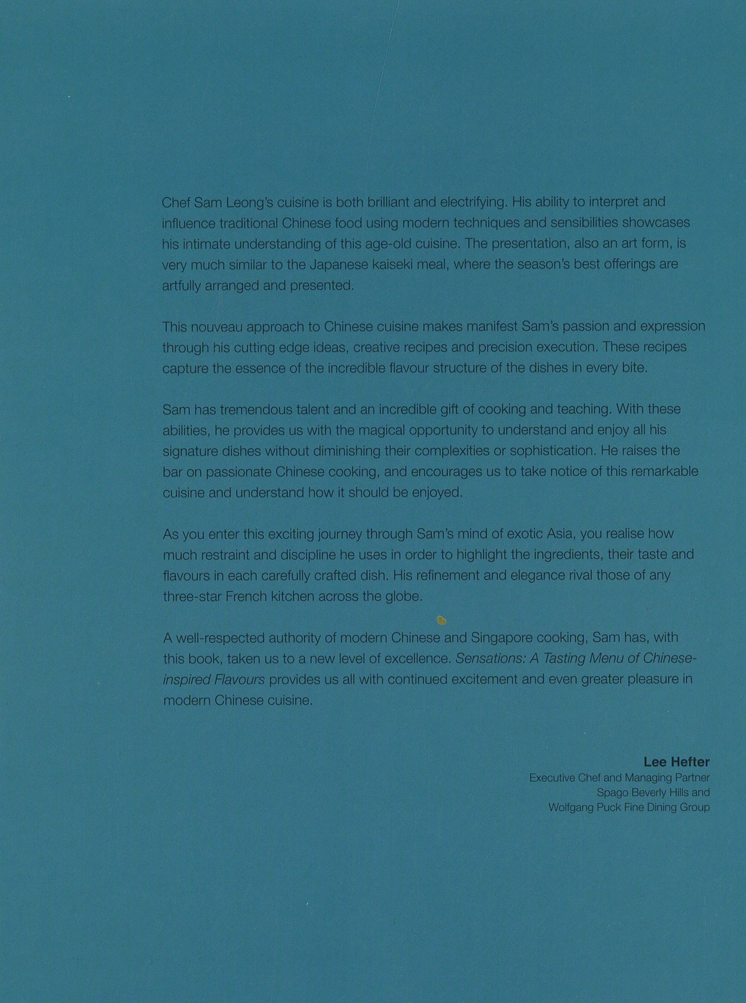 Sensations: A Tasting Menu of Chinese-inspired Flavours is a showcase of award-winning Chef Sam Leongs creativity and inspiration, as he brings Chinese cuisine up yet another level. From serving it Western-style in individual portions, to creating a whole experience, invoking not only the taste buds, but the total sensory pleasure of sight, smell, and touch, he creates fabulous dishes in small portions to showcase the best of modern Chinese cuisine.