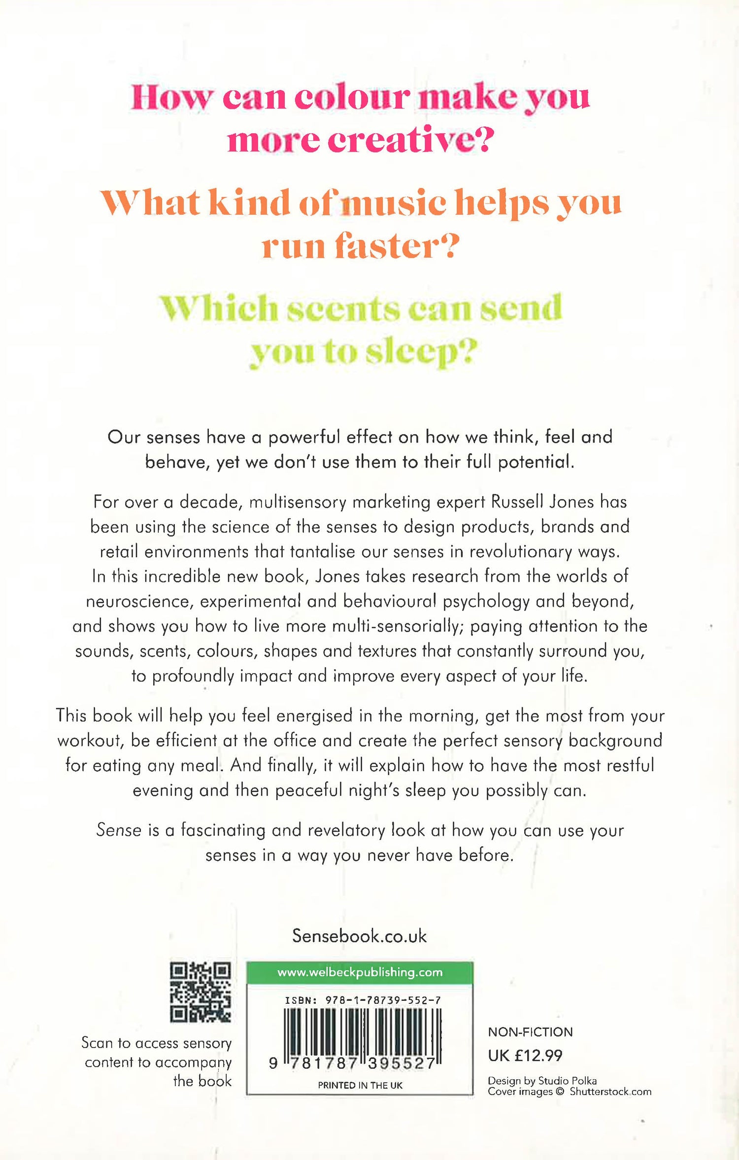 AS HEARD ON THE CHRIS EVANS SHOW A fascinating and revelatory look at how we can unlock the true potential of our five senses and use them to vastly improve every single part of our lives. How can colour prime you for creative thinking? What kind of music helps you run faster? Which scents can help you fall asleep? Our senses have a powerful effect on how we think, feel and behave; yet we don't use them to their full potential. For over a decade, multi-sensory marketing expert Russell Jones has been using the science of the senses to design products, brands and retail environments that tantalise our senses in revolutionary ways. In this incredible new book, Jones takes research from the worlds of neuroscience, experimental and behavioural psychology and beyond, and shows you how to live more multi-sensorially; paying attention to the sounds, scents, colours, objects, shapes and textures that constantly surround you, to profoundly impact and improve every aspect of your life. Whether it's helping you feel energised in the morning, get the most from your work-out, be efficient at the office, avoid getting caught in the traps of savvy retailers or creating the perfect sensory background to enjoy your food with. And, finally, he helps you have the most restful evening and night's sleep you possibly can. Sense is a fascinating and revelatory look at how you can use your senses in a way you never have before.