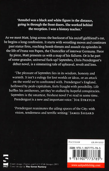 Annabel was a black and white figure in the distance, going in through the front doors. She worked behind the reception. I was a history teacher.' As we meet Matt, lying across the backseat of his on/off girlfriend's car, he begins a long confession. It starts with wrestling moves and continues past statue fires, reaching bomb threats and assault via episodes in the life of Franz von Papen, the Chancellor of interwar Germany. Piece by piece, Matt presents us with a map of his failures. Or is he part of some grander, universal fuck-up? Septembers, Christopher Prendergast's debut novel, is a simmering tale of upheaval, revolt and loss.