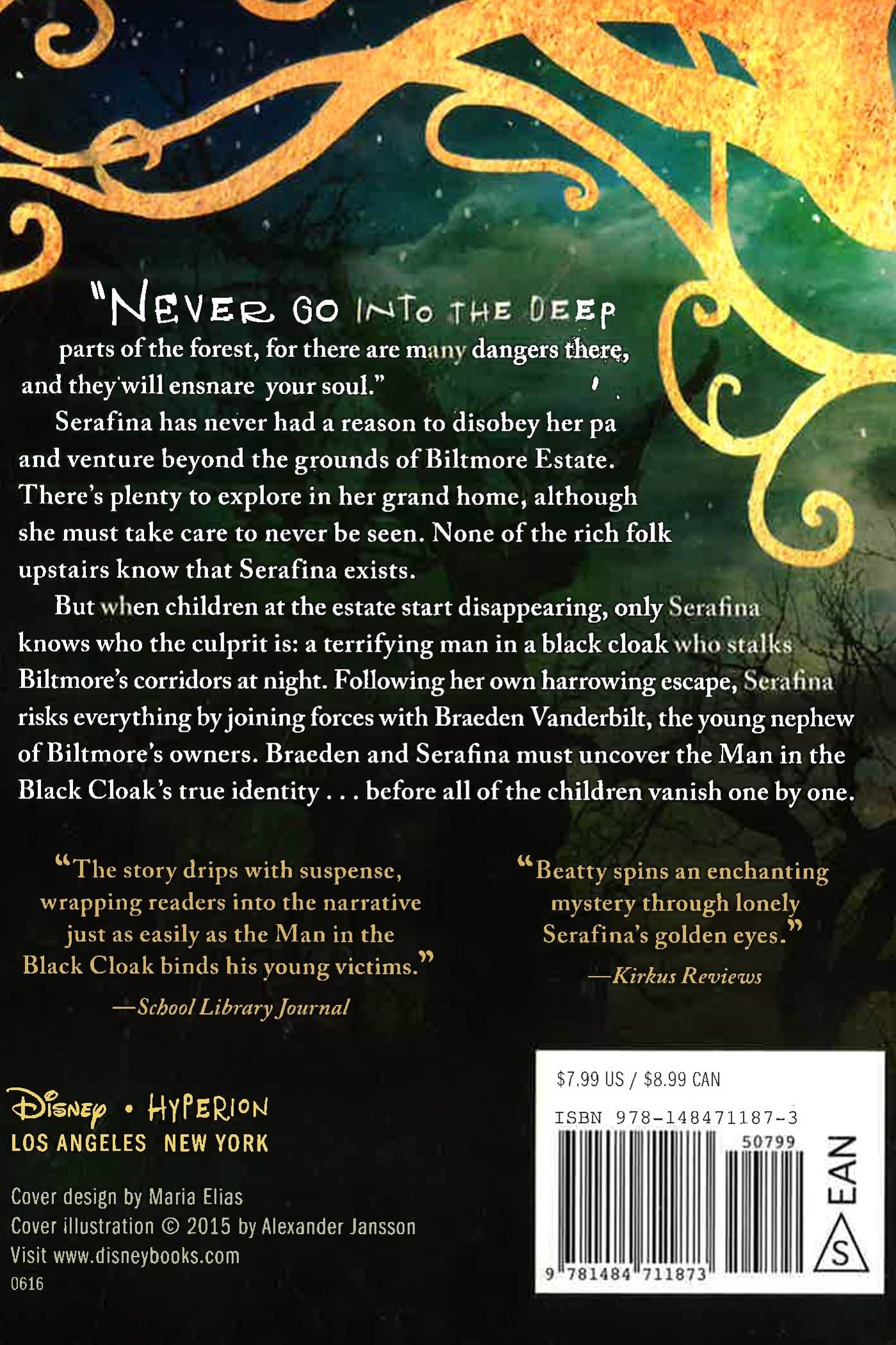 "Never go into the forest, for there are many dangers there, and they will ensnare your soul."Serafina has never had a reason to disobey her pa and venture beyond the grounds of Biltmore Estate. There's plenty to explore in Mr. and Mrs. Vanderbilt's vast and opulent home, but she must take care to never be seen. None of the rich folk upstairs know that Serafina exists; she and her pa have lived in the basement for as long as Serafina can remember. She has learned to prowl through the darkened corridors at night, to sneak and hide, using the mansion's hidden doors and secret passageways.But when children at the estate start disappearing, only Serafina knows the clues to follow. A mysterious man in a black cloak stalks Biltmore's corridors at night. Following her own harrowing escape, Serafina risks everything by joining forces with Braeden Vanderbilt, the young nephew of Biltmore's owners. Braeden and Serafina must uncover the Man in the Black Cloak's true identity before all of the children vanish one by one.Serafina's hunt leads her into the very forest that she has been taught to fear, where she discovers a forgotten legacy of magic. In order to save the children of Biltmore, Serafina must not only face her darkest enemy, but delve into the strange mystery of her own identity.