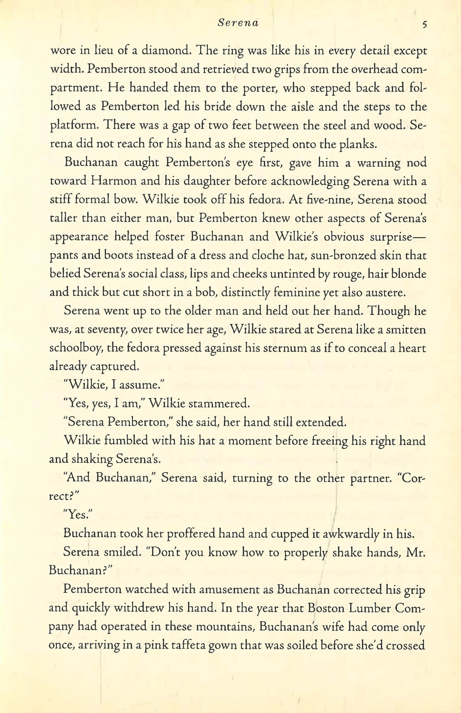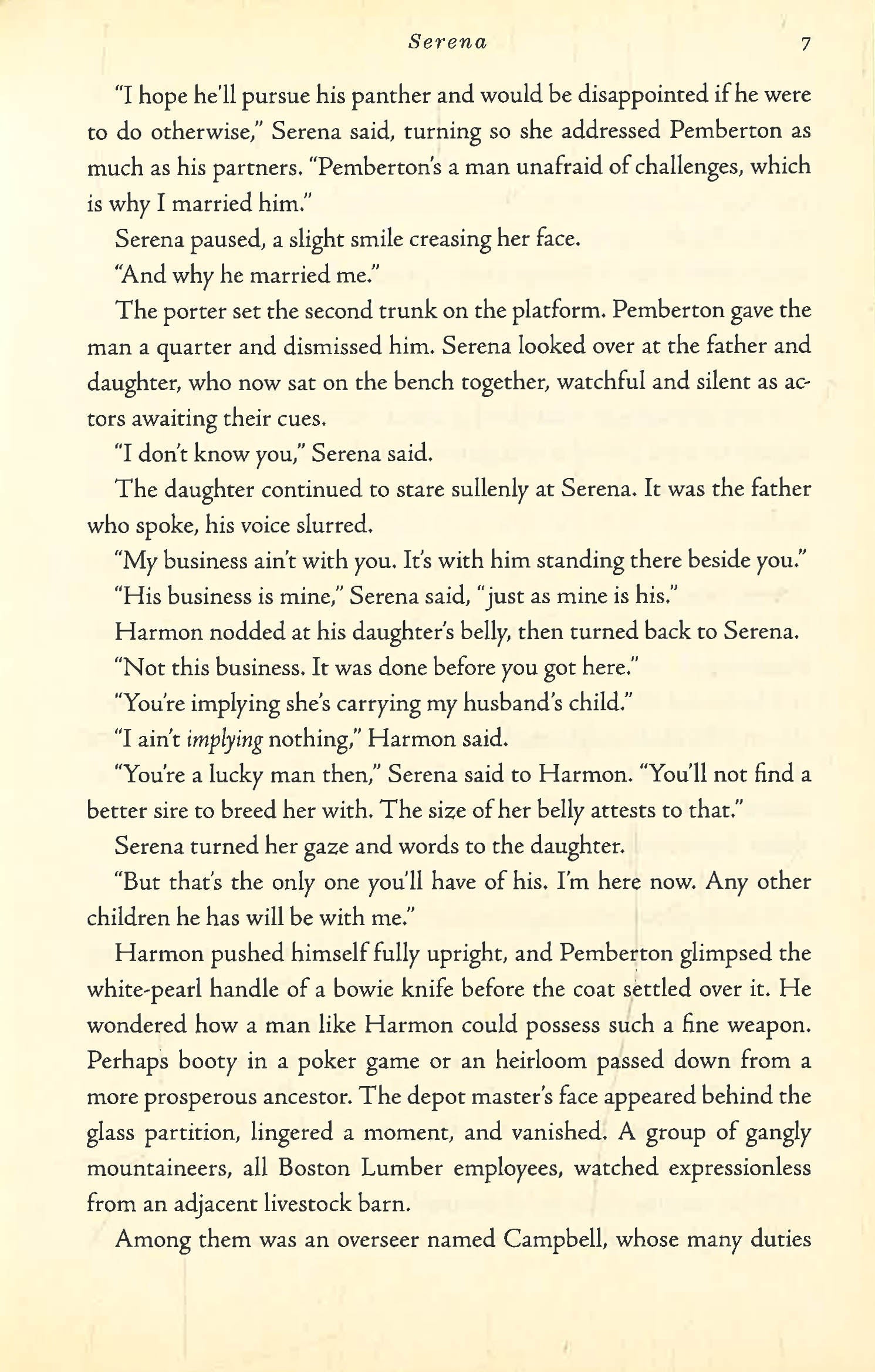 The year is 1929, and newlyweds George and Serena Pemberton arrive in North Carolina to create a timber empire. Although George has already lived in the camp long enough to father an illegitimate child, Serena is new to the mountains—but she soon shows herself to be the equal of any worker, overseeing crews, hunting rattlesnakes, even saving her husband's life in the wilderness.