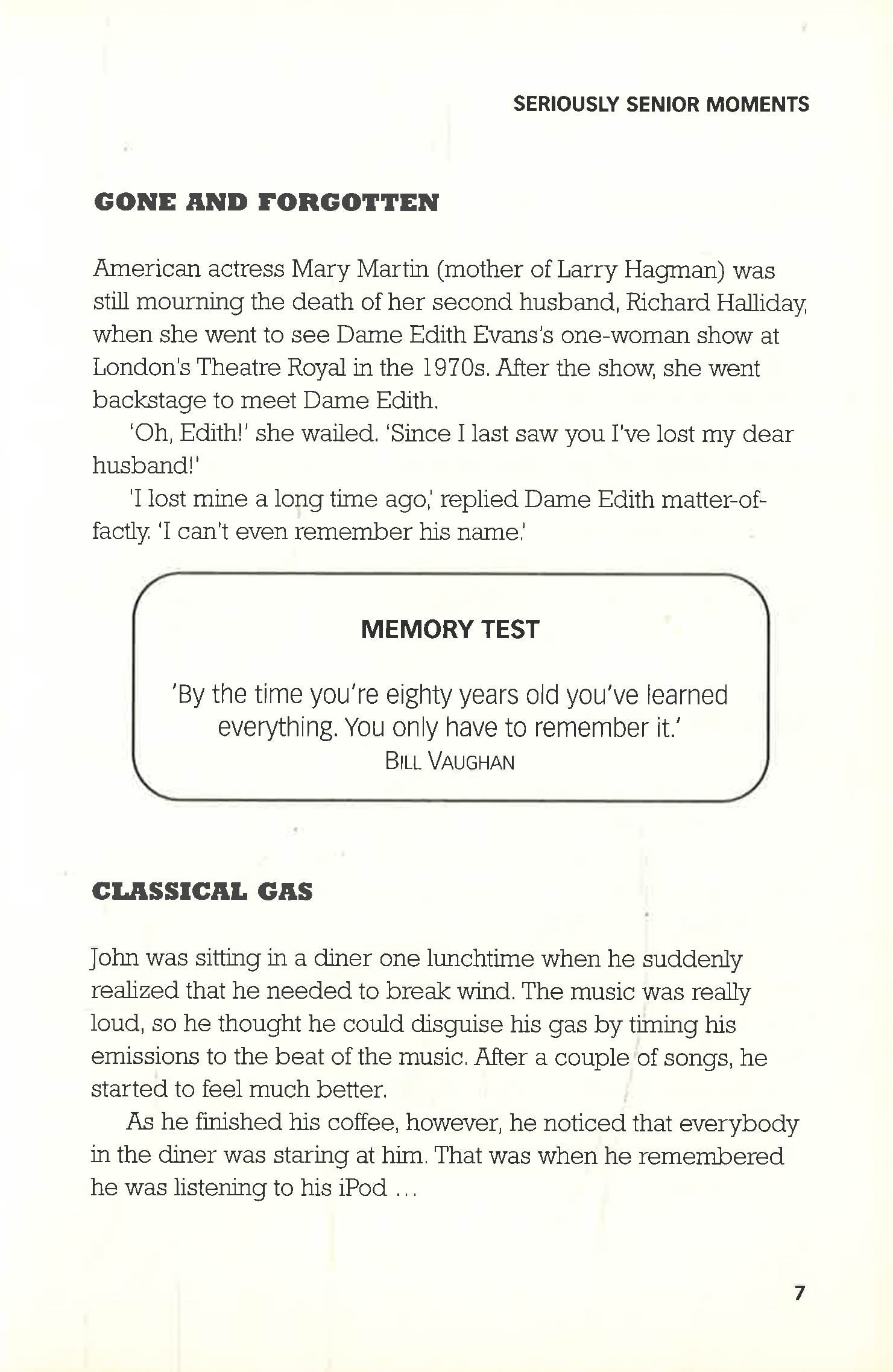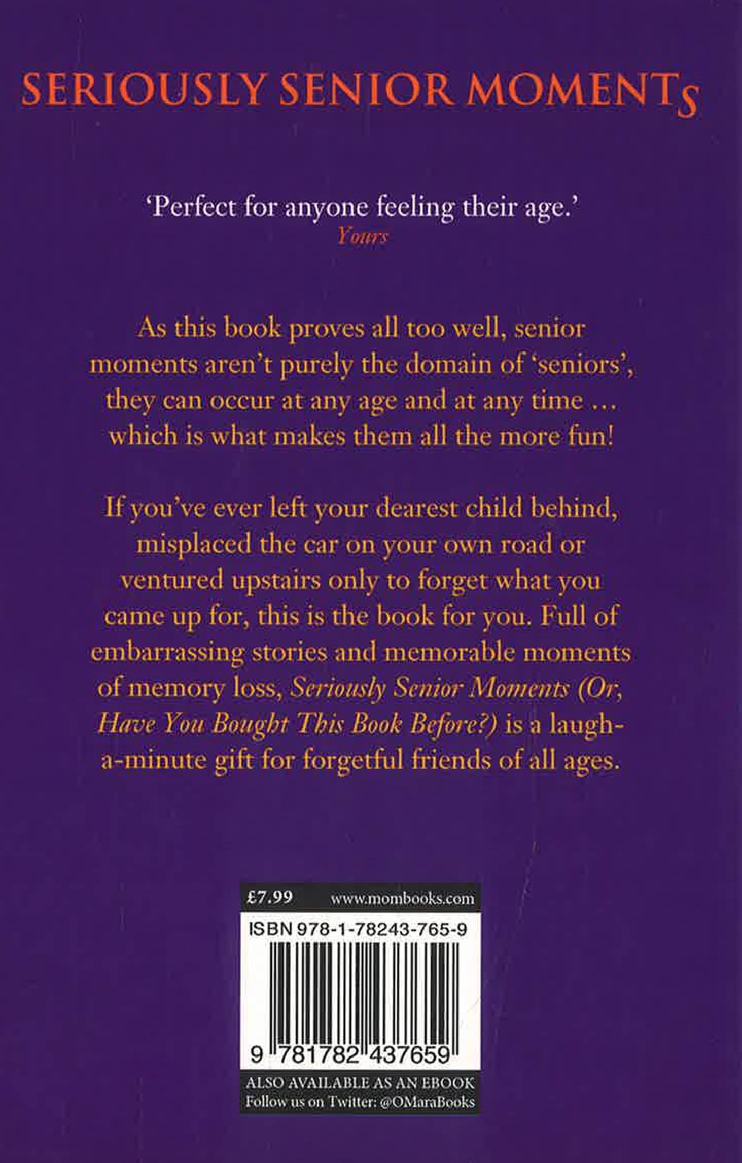 Entertaining and uplifting, this book is a hilarious look at those embarrassing setbacks experienced in one's senior years. From picking up the wrong child from school, to misplacing your car somewhere down your own road, the signs are there that the old memory isn't what it used to be. Containing a wealth of jokes, anecdotes, quips and quotes from like-absent-minded seniors, across a range of funny and undeniably familiar scenarios, this book will have people laughing out loud in shameful recognition that they are, in fact, getting on a bit. So, find your reading glasses (they're on your head) and delve into this side-splitting guide that will help you laugh at those senior moments as well as keep them at bay.