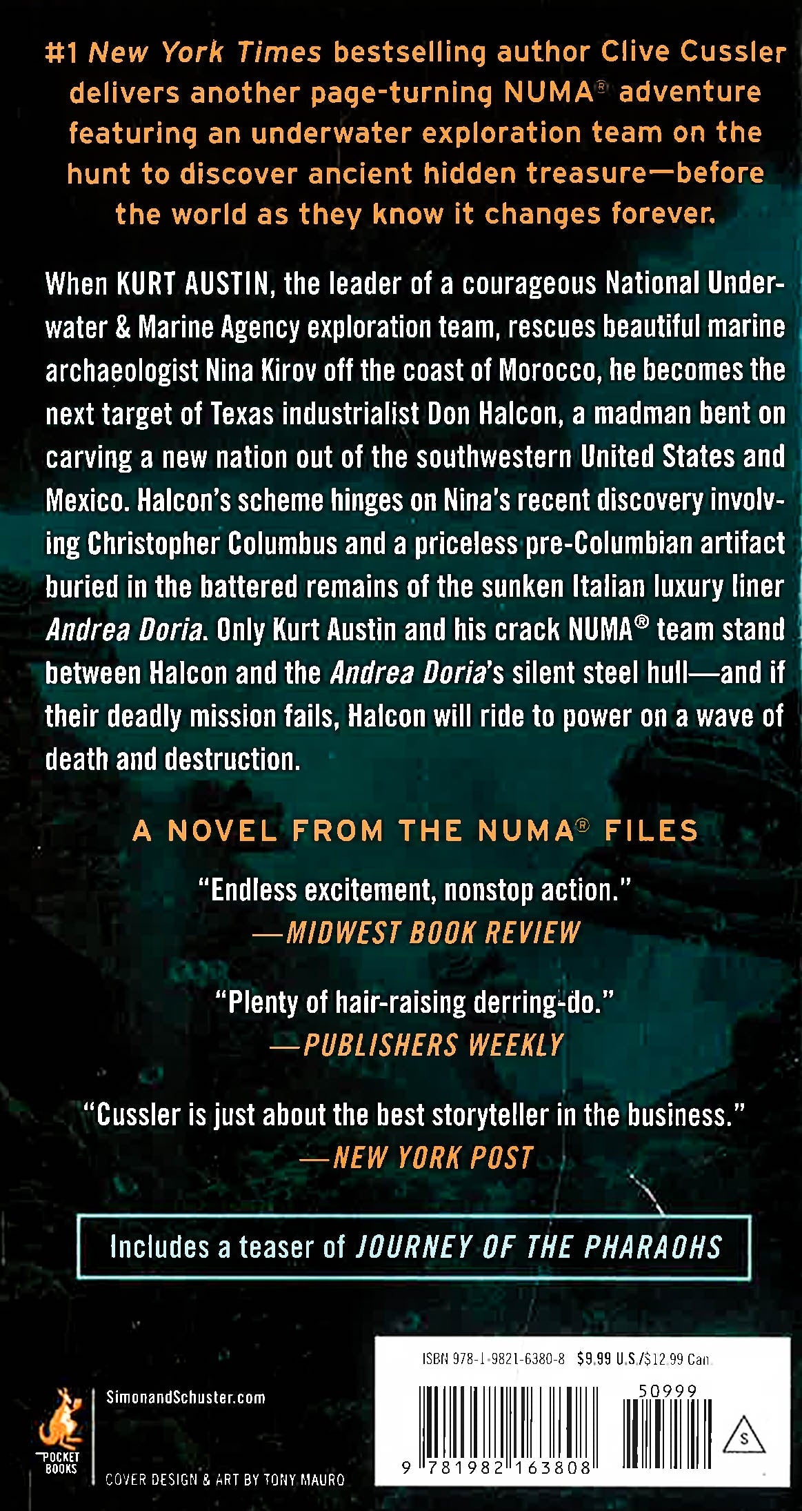 When Kurt Austin, the leader of a courageous National Underwater and Marine Agency exploration team, rescues beautiful marine archaeologist Nina Kirov off the cost of Morocco, he becomes the next target of Texas industrialist Don Halcon. A madman bent on carving a new nation out of the southwestern United States and Mexico, Halcon’s scheme hinges on Nina’s recent discovery involving Christopher Columbus and a priceless pre-Columbian antiquity buried in the battered remains of the sunken Italian luxury line Andrea Doria. Only Kurt Austin and his NUMA team stand between Halcon and the Andrea Doria’s silent steel hull—and if their deadly mission fails, Halcon will ride to power on a wave of death and destruction.
