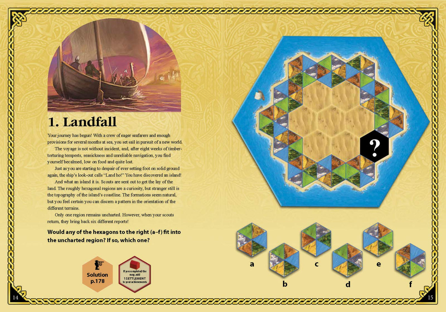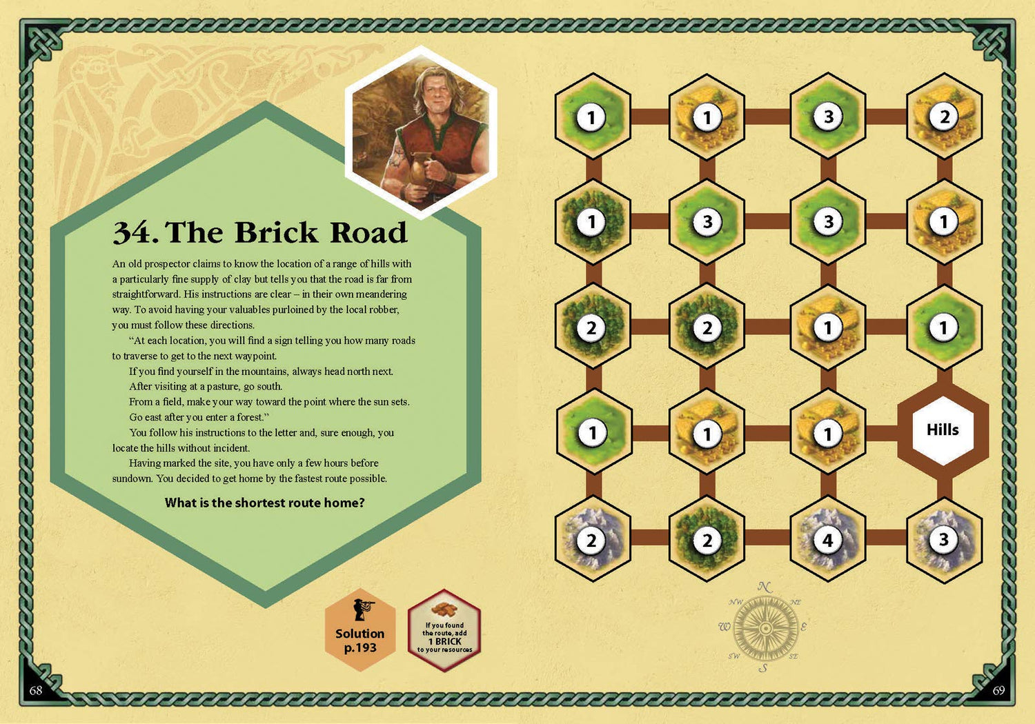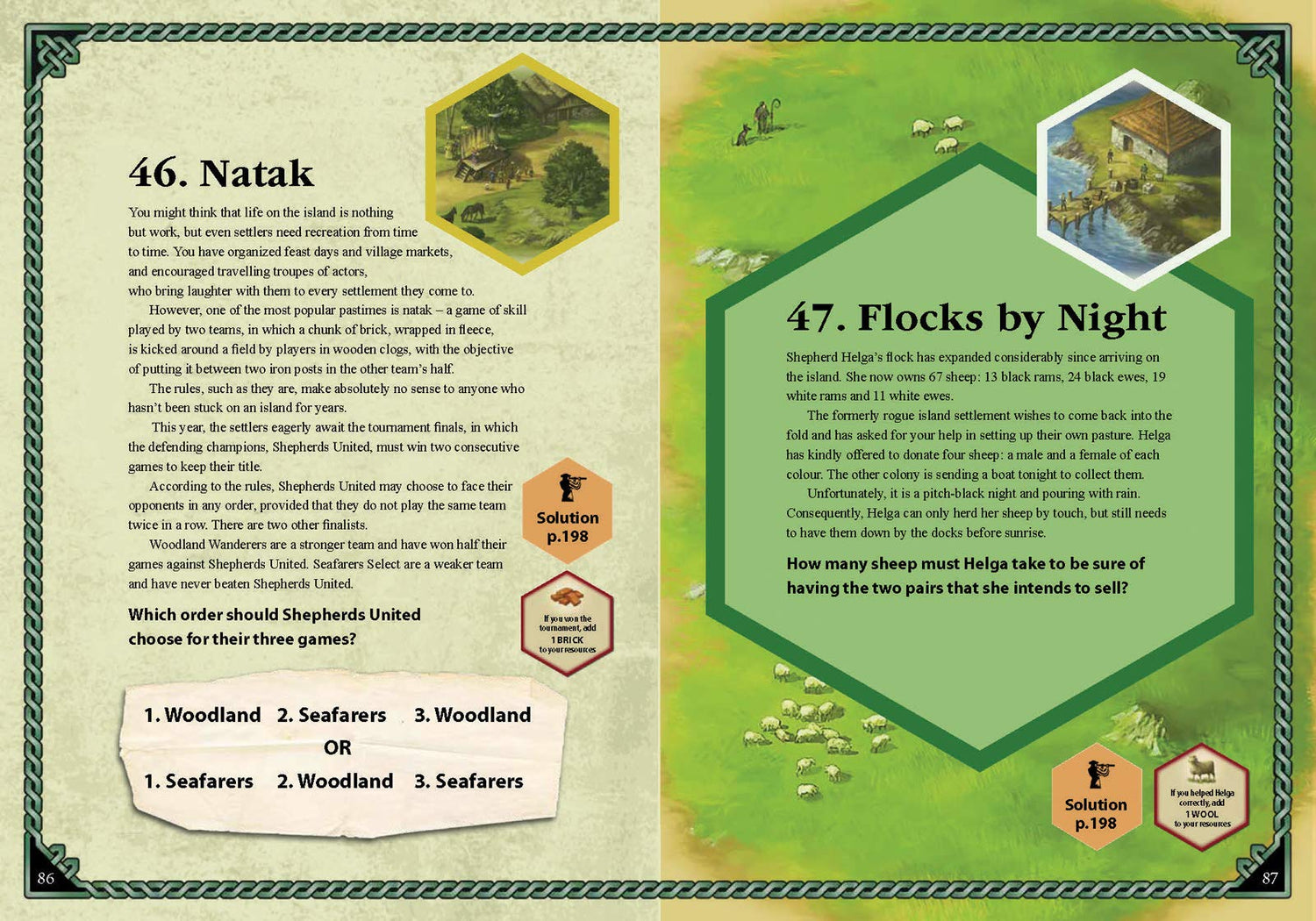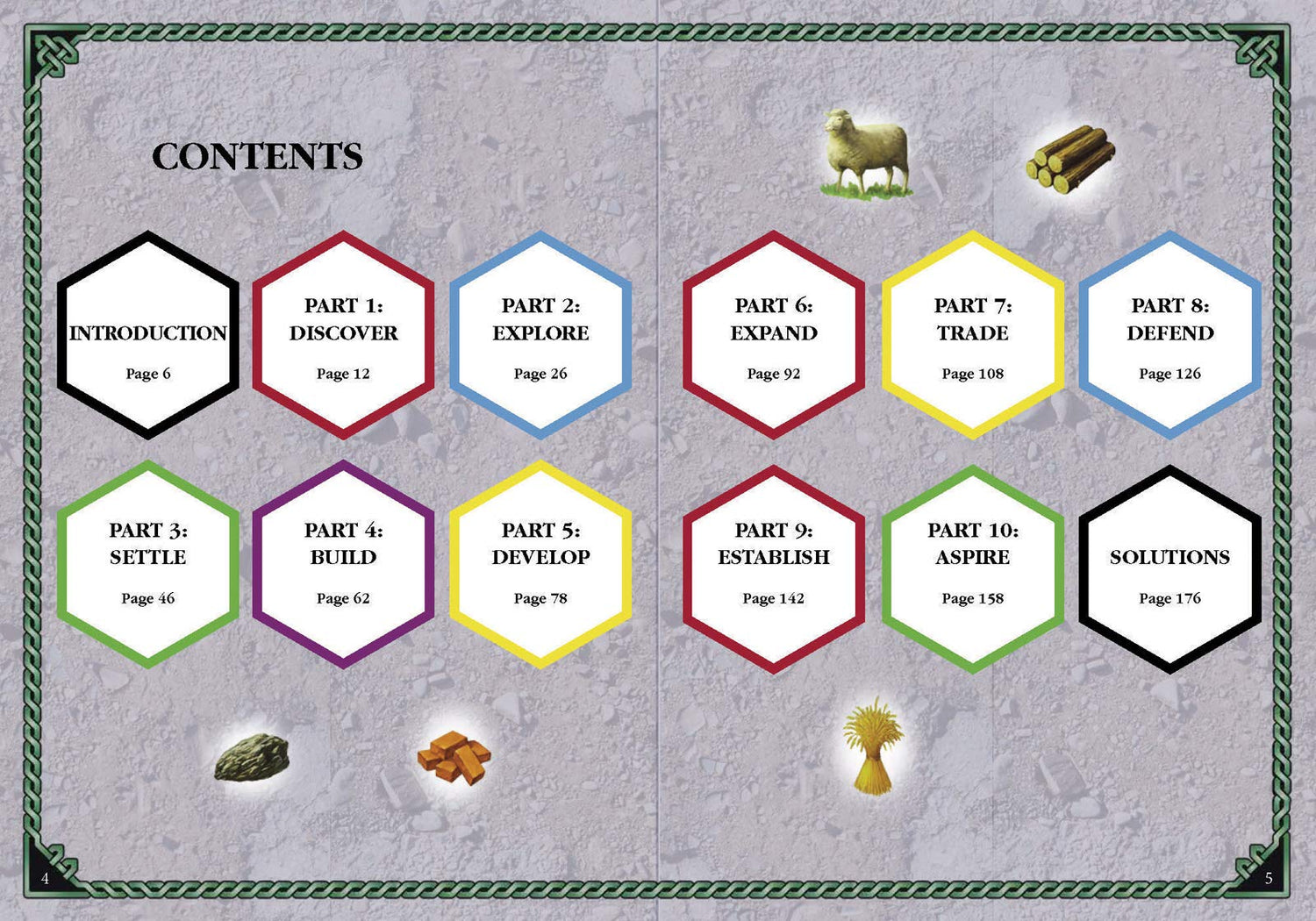 This book includes 10 chapters of puzzles, each containing 10 puzzles set in the Catan world. The puzzles may be solved on their own or as part of a narrative that runs through the book. Each correctly answered puzzle awards the reader resources, which can eventually be converted into achievements and victory points. Upon earning enough victory points, the reader wins the book! Catan Puzzle Book is also fantastically illustrated throughout with more than 150 in-world artworks.