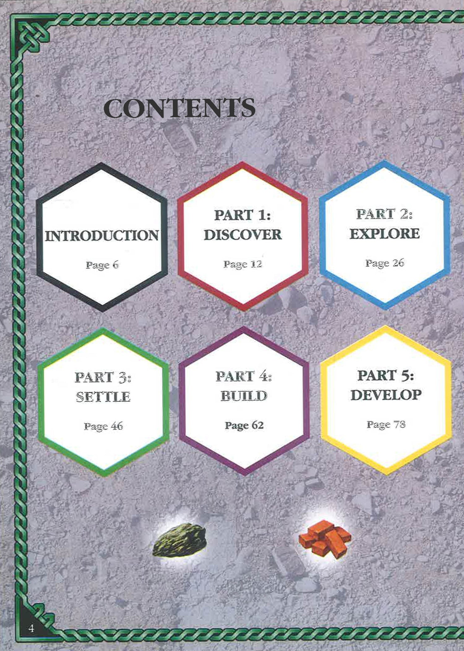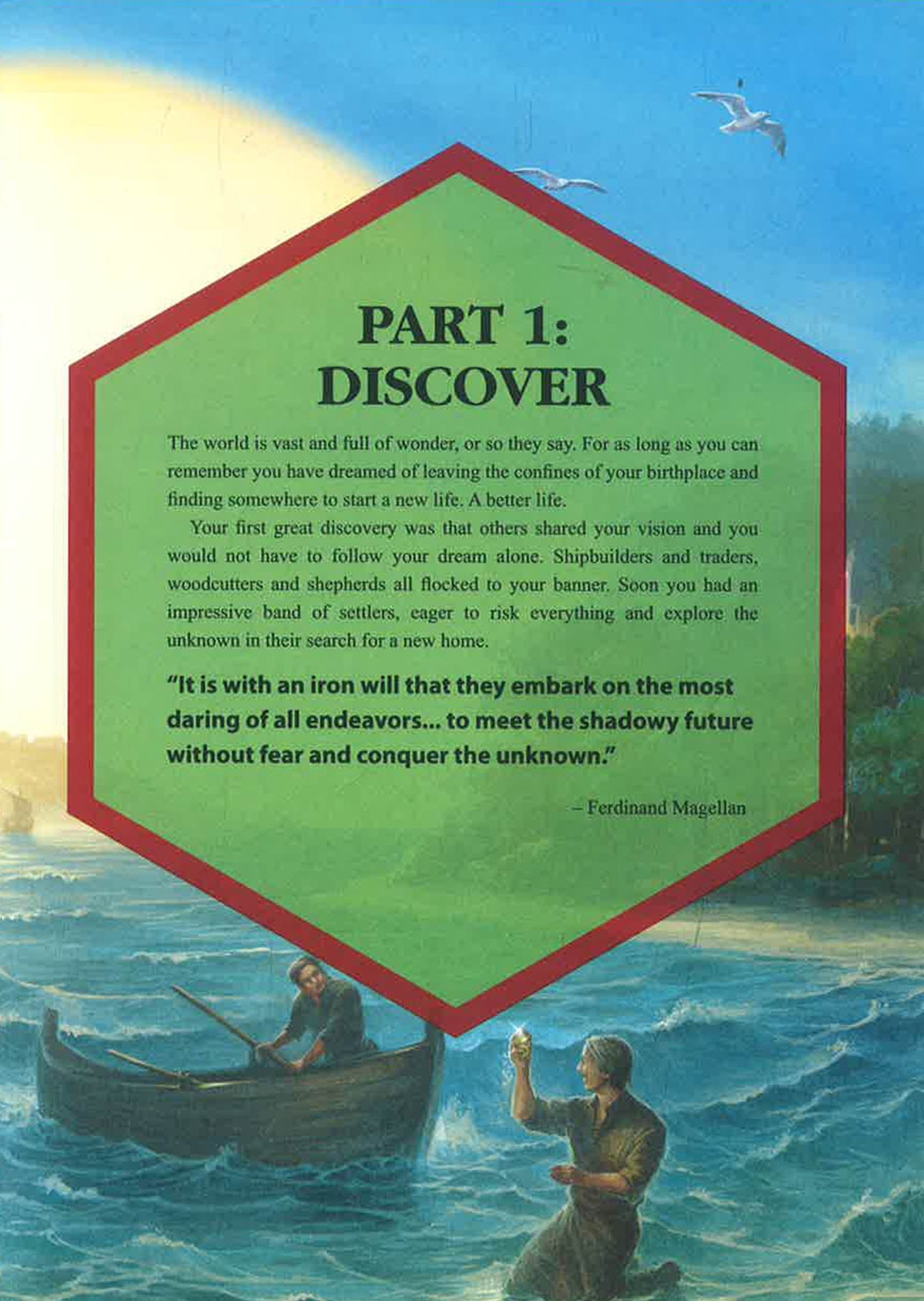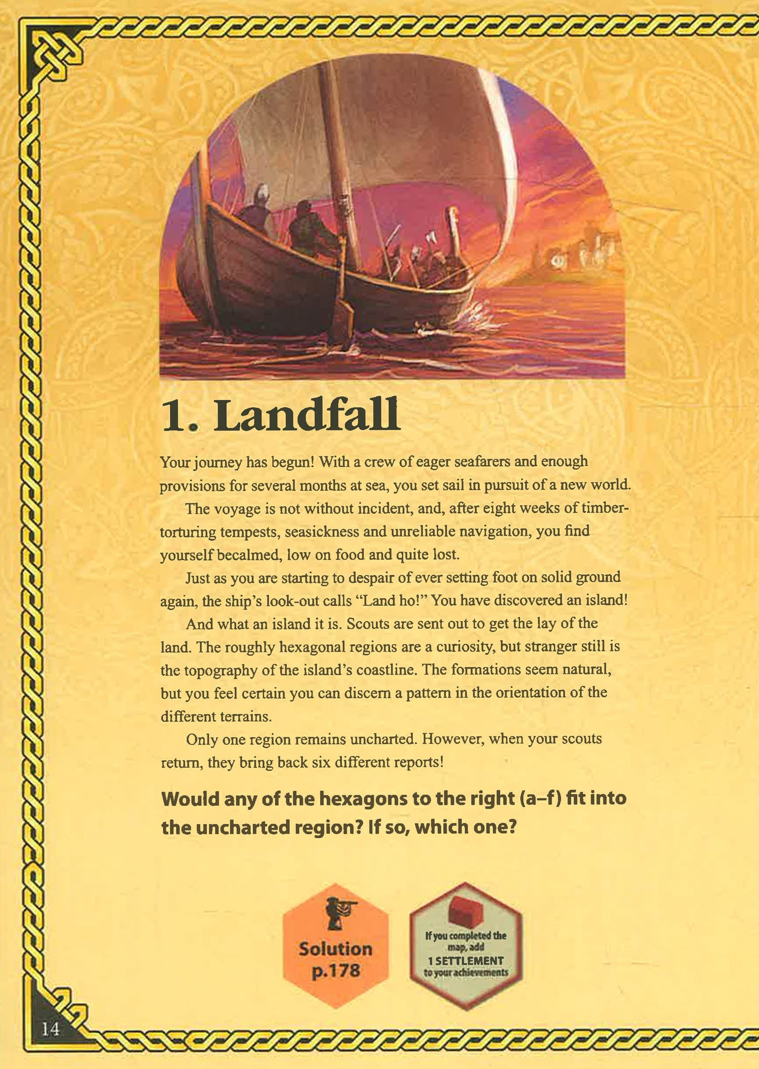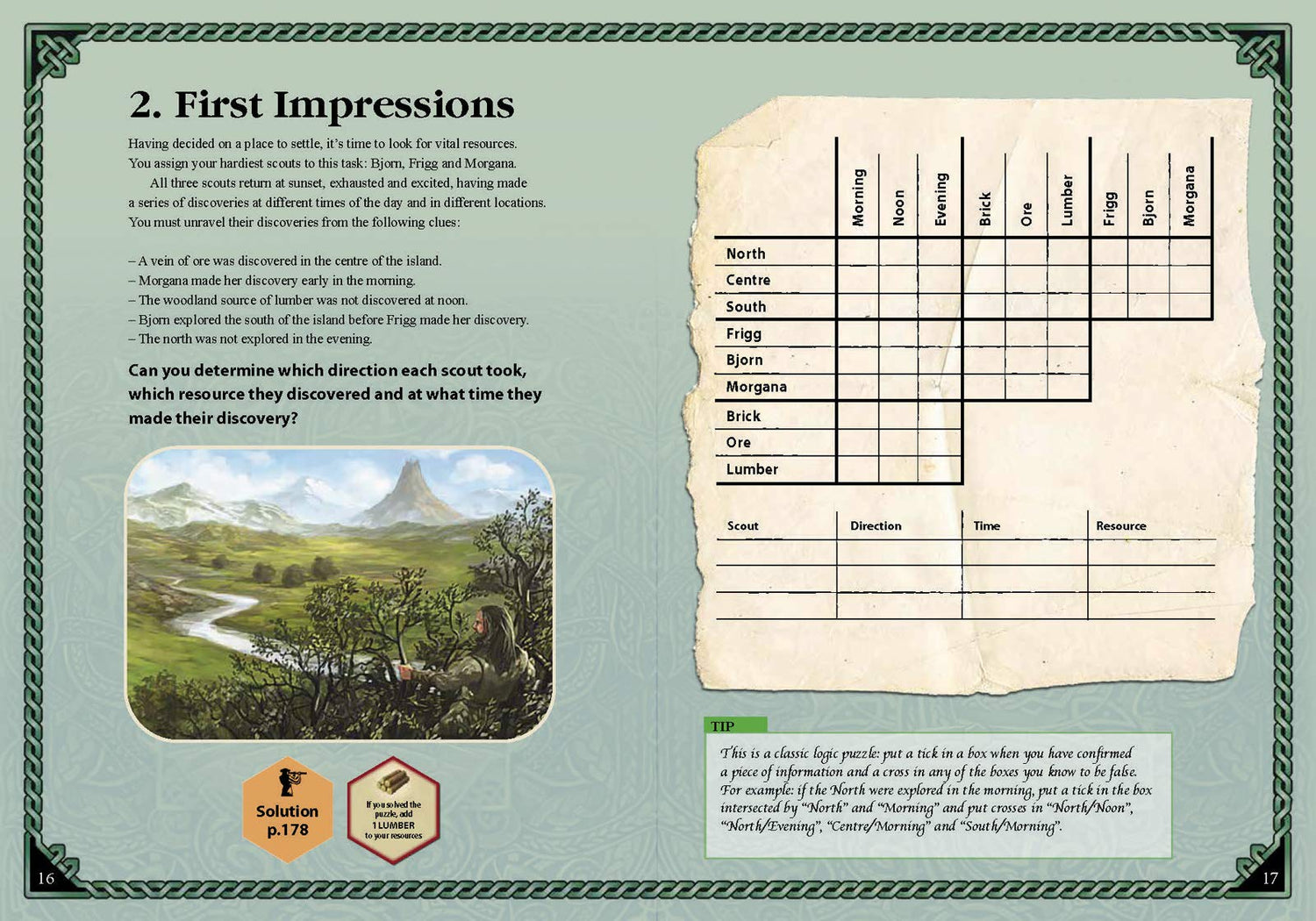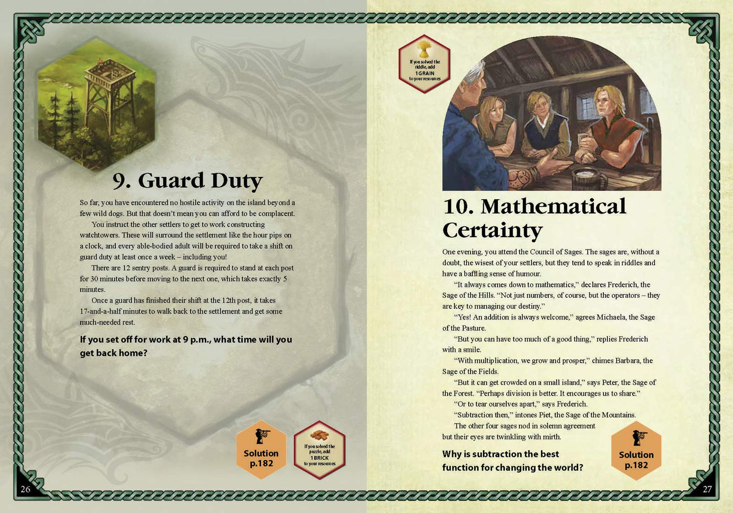 This book includes 10 chapters of puzzles, each containing 10 puzzles set in the Catan world. The puzzles may be solved on their own or as part of a narrative that runs through the book. Each correctly answered puzzle awards the reader resources, which can eventually be converted into achievements and victory points. Upon earning enough victory points, the reader wins the book! Catan Puzzle Book is also fantastically illustrated throughout with more than 150 in-world artworks.