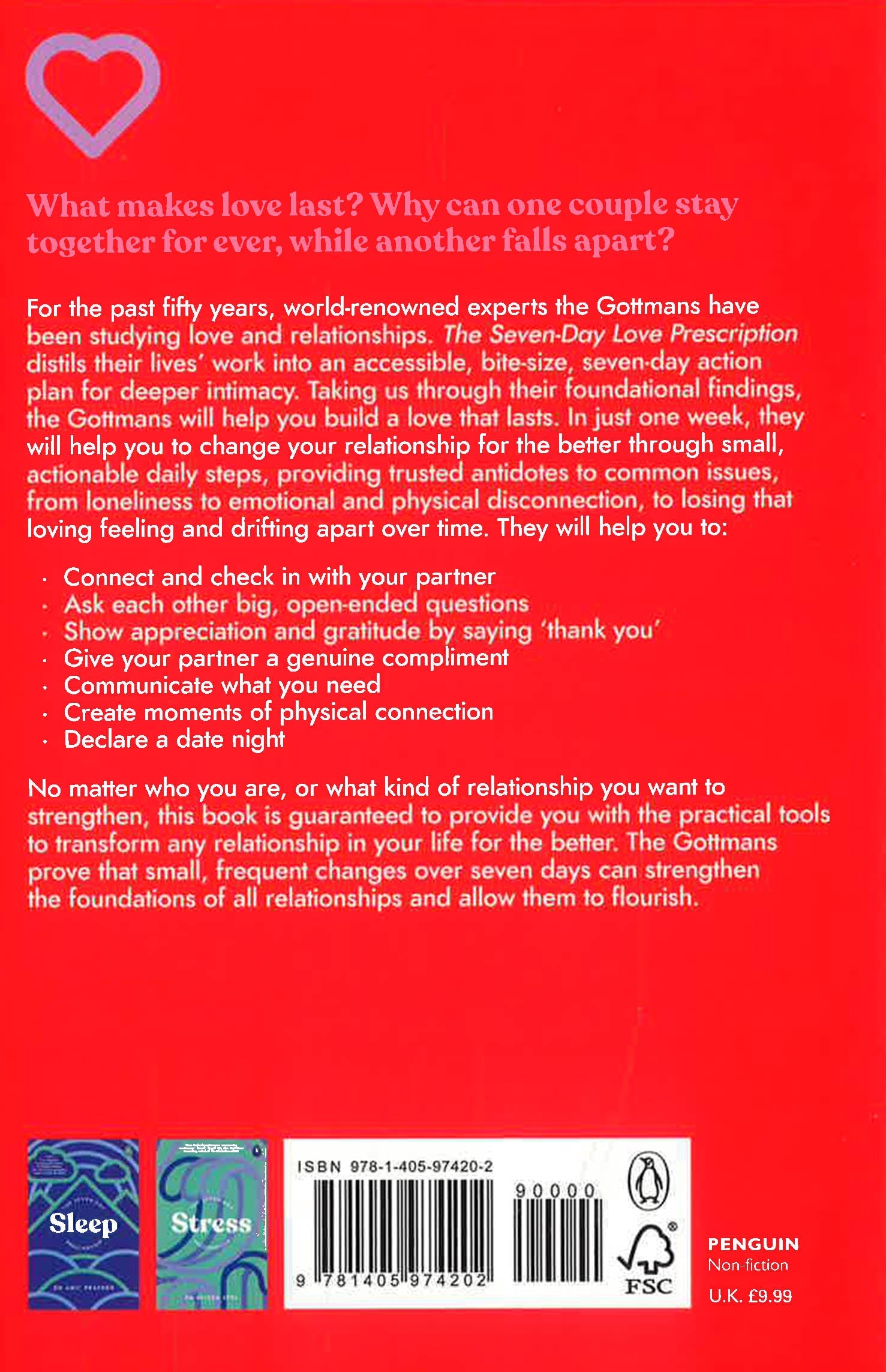 No matter who you are, or what kind of relationship you want to strengthen, The Seven-Day Love Prescription is guaranteed to provide you with the practical tools to transform any relationship in your life for the better. The Gottmans prove that small frequent changes over just seven days can strengthen the foundations of all relationships, allow them to flourish, and create big, long-lasting change over time.