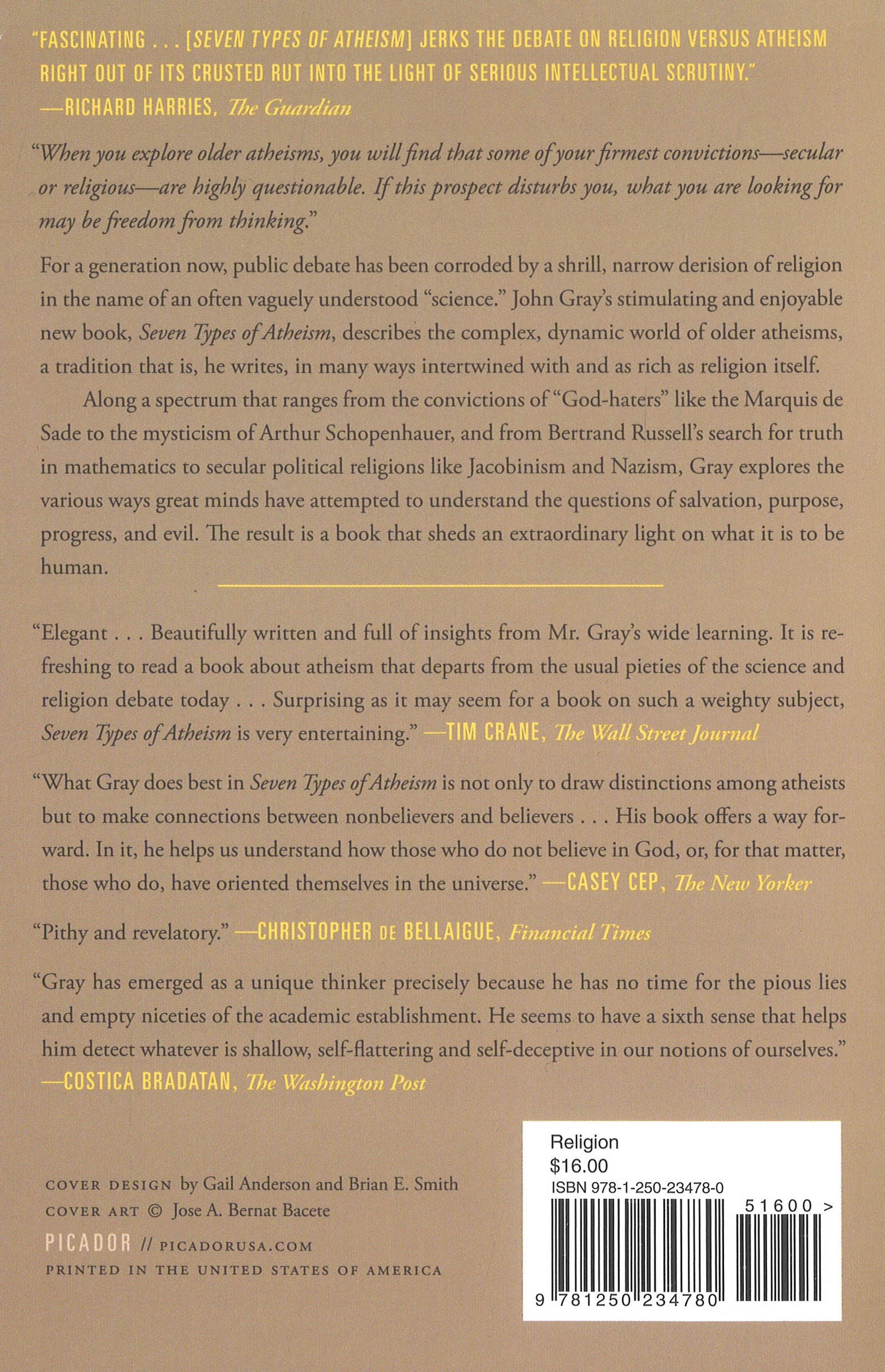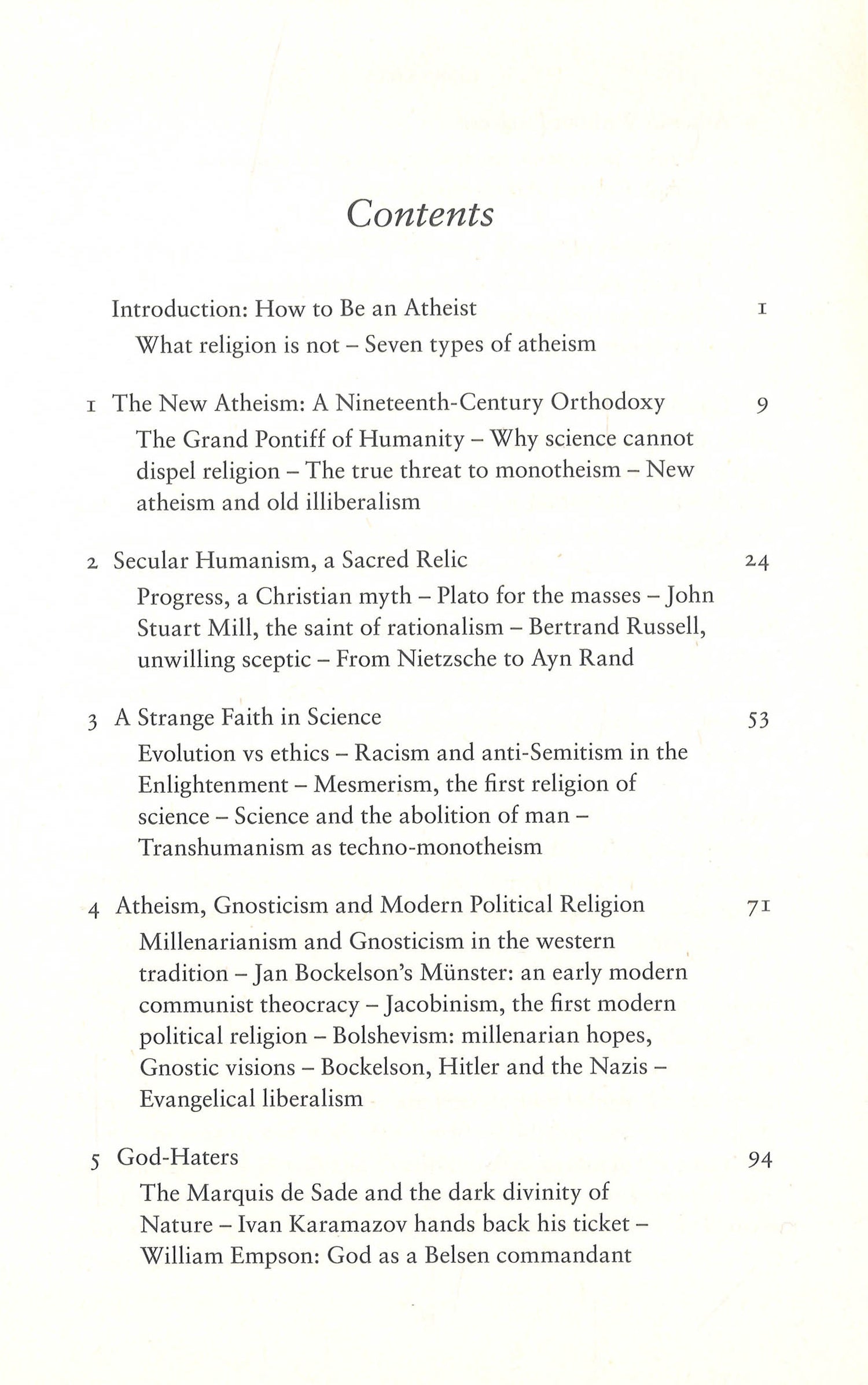 Along a spectrum that ranges from the convictions of ?od-haters·like the Marquis de Sade to the mysticism of Arthur Schopenhauer, from Bertrand Russell? search for truth in mathematics to secular political religions like Jacobinism and Nazism, Gray explores the various ways great minds have attempted to understand the questions of salvation, purpose, progress, and evil. The result is a book that sheds an extraordinary light on what it is to be human.