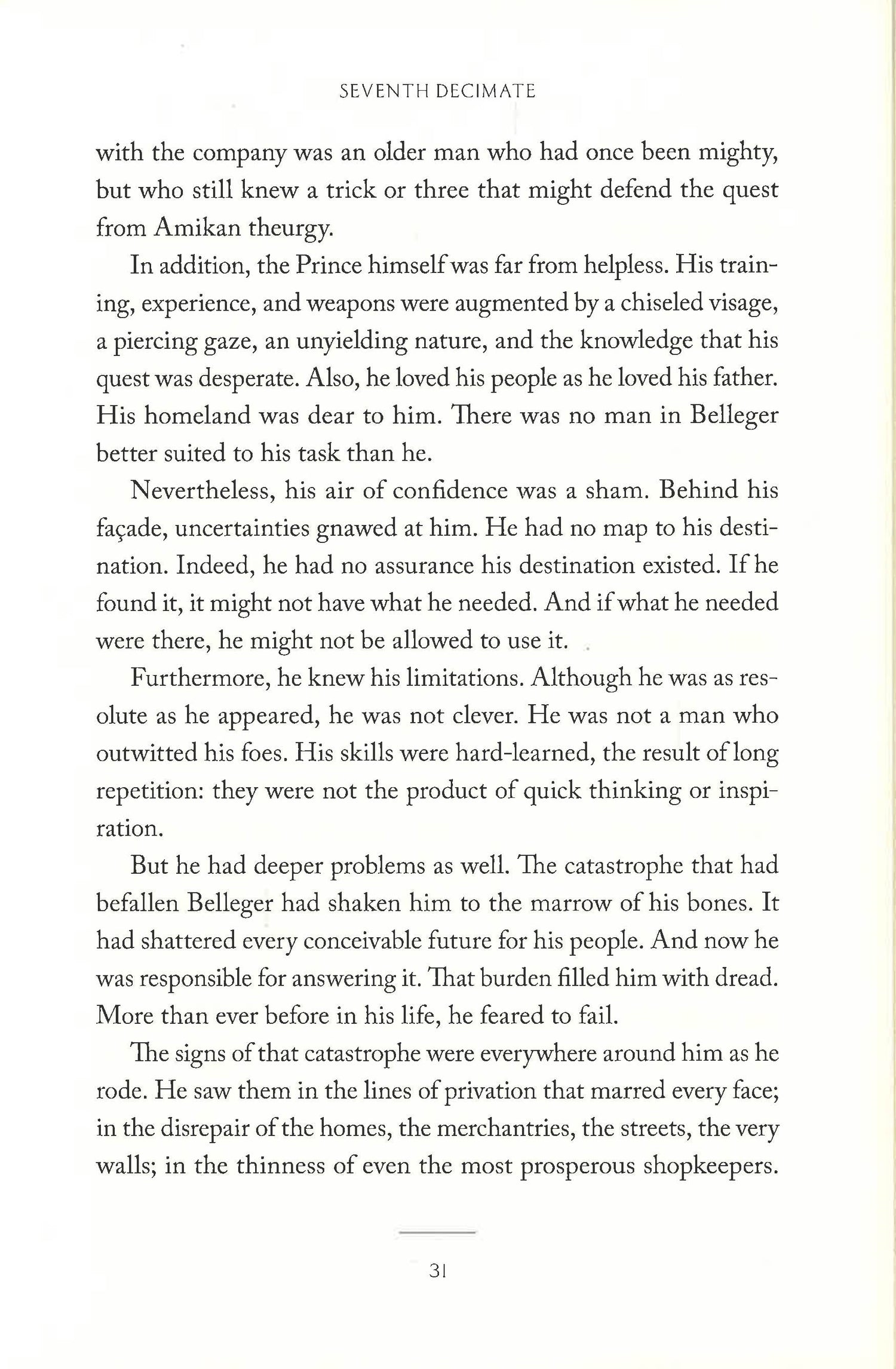 Grasping at any chance to save his beloved homeland, Prince Bifalt of Belleger sets out on a hazardous journey across the unmapped wastelands to the east. With Elgart, his last comrade, Bifalt pursues the long-hidden trail of the one object that might be able to turn the tide of the endless war - a book entitled The Seventh Decimate.