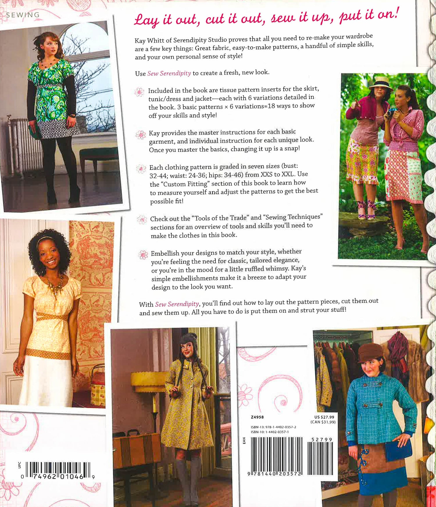 All you need to re-make your wardrobe are a few key things: great fabric, easy-to-make patterns, a handful of simple skills, and your own personal sense of style. Included are tissue pattern inserts for the skirt, tunic/dress and jacket - each with 6 variations detailed in the book. 3 basic patterns x 6 variations = 18 wasy to show off your skills and style. Kay Whitt provides the master instructions for each basic garment, and individual instruction for each unique look. Once you master the basics, changing it up is a snap. Each clothing pattern is graded in seven sizes. Use the "Custom Fitting" section to learn how to measure yourself and adjust the patterns to get the best possible fit. Check out the "Tools of the Trade" and "Sewing Techniques" sections for an overview of tools and skills you'll need to make the clothes in this book. Embellish your designs to match your style, whether you're feeling the need for classic, tailored elegance, or you're in the mood for a little ruffled whimsy. Kay's simple embellishments make it a breeze to adapt your design to the look you want.