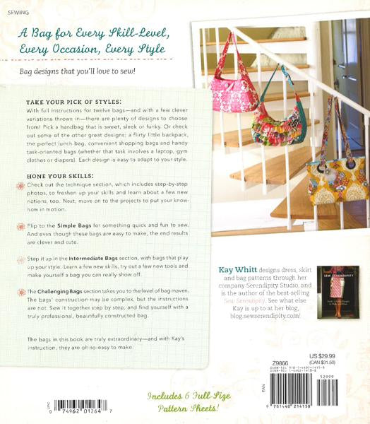 Kay Whitt loves designing bags, and you're going to love sewing them! Take Your Pick of StylesWith full instructions for twelve bags-and with a few clever variations thrown in-there are plenty of designs to choose from! Pick a handbag that is sweet, sleek or funky. Or check out some of the other great designs: a flirty little backpack, the perfect lunch bag, convenient shopping bags and handy task-oriented bags (whether that task involves a laptop, gym clothes or diapers). Each design is easy to adapt to your style. Hone Your SkillsCheck out the technique section, which includes step-by-step photos, to freshen up your skills and learn about a few new notions, too. Next, move on to the projects to put your know-how in motion.Flip to the Simple Bags for something quick and fun to sew. And even though these bags are easy to make, the end results are clever and cute.Step it up in the Intermediate Bags section, with bags that play up your style. Learn a few new skills, try out a few new tools and make yourself a bag you can really show off.The Challenging Bags section takes you to the level of bag maven. The bags' construction may be complex, but the instructions are not. Sew it together step by step, and find yourself with a truly professional, beautifully constructed bag. The bags in this book are truly extraordinary-and with Kay's instruction, they are oh-so-easy to make.