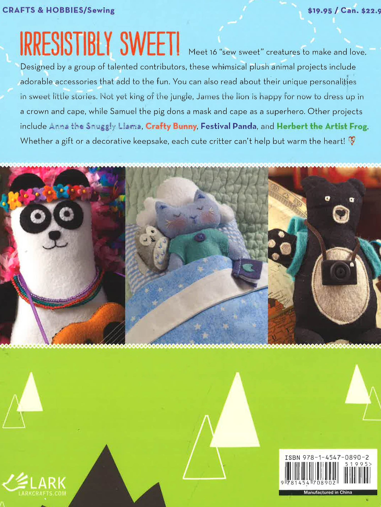 No one can resist a stitched softie! From a pig clad in a superhero costume to a catnapping kitty hugging a tiny toy owl, these 16 plush creatures really are "sew sweet." Crafters will love them all, including a Fairy Mouse with sequined wings and a wand; a Baker Squirrel in her chefs outfit; and a Polar Princess Polar Bear. Each one comes with personalized accessories and a short introductory story.