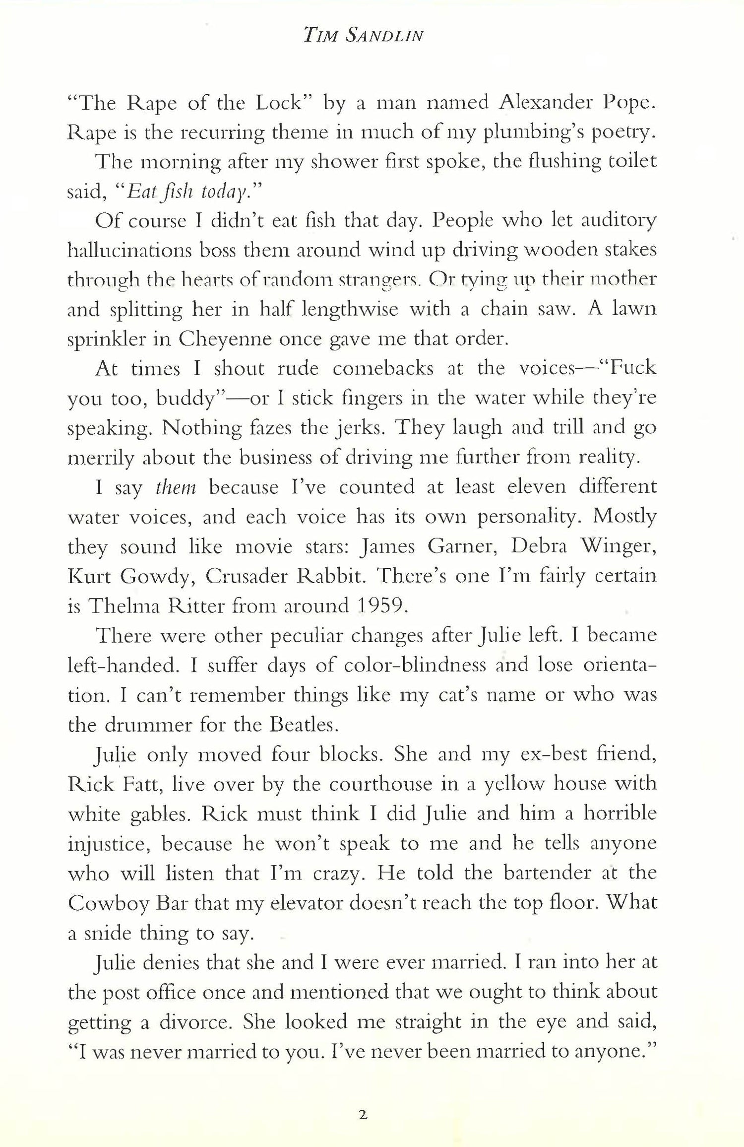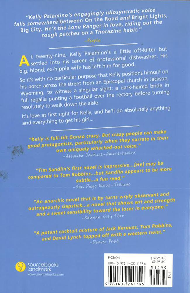 Soon to be a major motion picture called "The Right Kind of Wrong," starring Ryan Kwanten from True Blood! "Kelly Palamino's engagingly idiosyncratic voice falls somewhere between On the Road and Bright Lights, Big City. He's the Lone Ranger in love, riding out the rough patches on a Thorazine habit." -People At twenty-nine, Kelly Palamino's a little off-kilter but settled into his career of professional dishwasher. His big, blond, ex-hippie wife has left him for good. So it's with no particular purpose that Kelly positions himself on his porch across the street from an Episcopal church in Jackson, Wyoming, to witness a singular sight: a dark-haired bride in full regalia punting a football over the rectory before turning resolutely to walk down the aisle. It's love at first sight for Kelly, and he'll do absolutely anything and everything to get his girl... "Kelly is full-tilt Gonzo crazy. But crazy people can make good protagonists, particularly when they narrate in their own uniquely whacked-out voice." -Atlanta Journal-Constitution "Tim Sandlin's first novel is impressive...[He] may be compared to Tom Robbins...but Sandlin appears to be more subtle...a fun read." -San Diego Union-Tribune "An anarchic novel that is by turns wryly observant and outrageously slapstick...a novel that shows wit and strength and a sweet sensibility toward the loser in everyone." -Kansas City Star "A potent cocktail mixture of Jack Kerouac, Tom Robbins, and David Lynch topped off with a western twist." -Denver Post