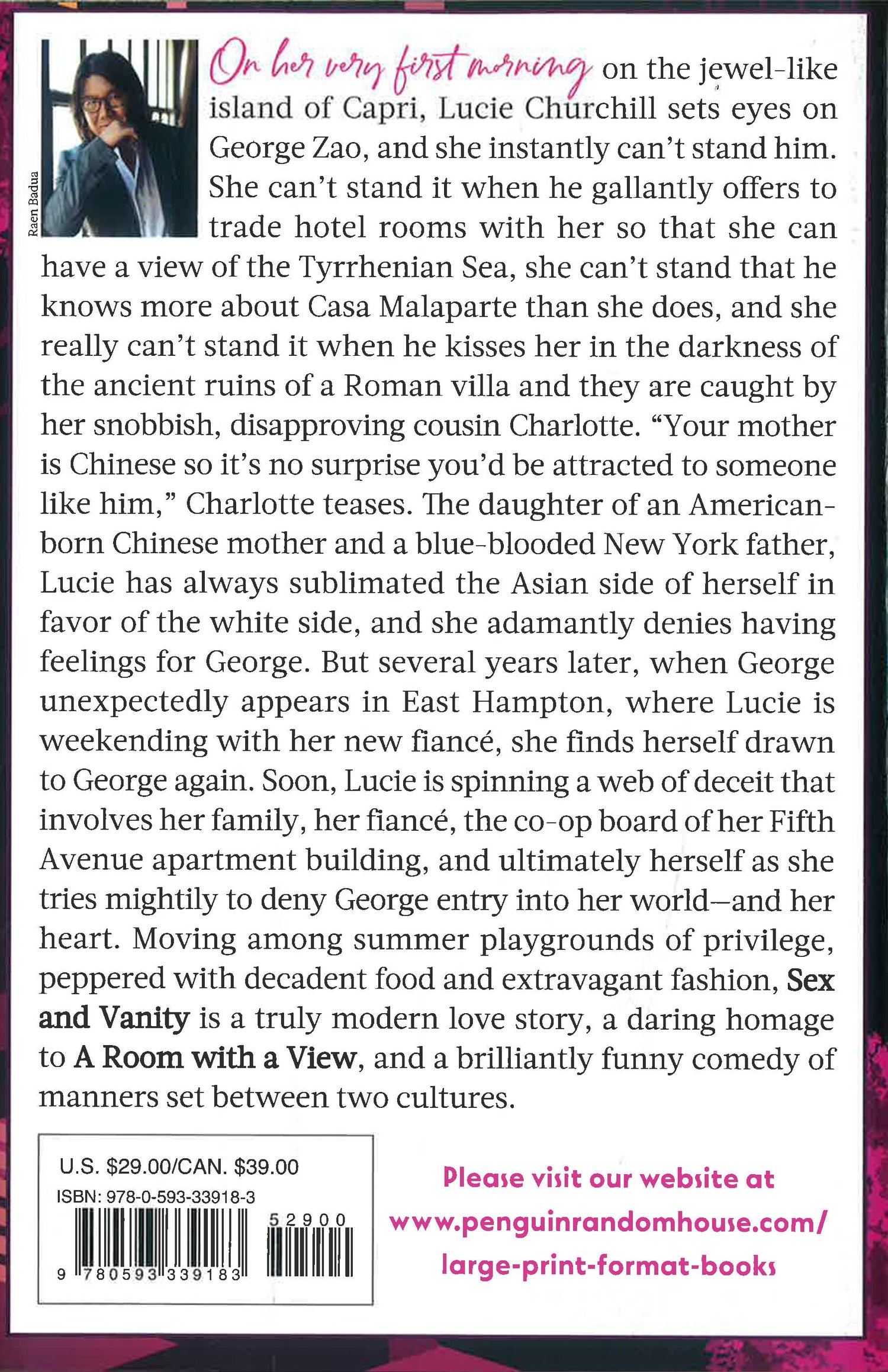 On her very first morning on the jewel-like island of Capri, Lucie Churchill sets eyes on George Zao and she instantly can't stand him. She can't stand it when he gallantly offers to trade hotel rooms with her so that she can have a view of the Tyrrhenian Sea, she can't stand that he knows more about Casa Malaparte than she does, and she really can't stand it when he kisses her in the darkness of the ancient ruins of a Roman villa and they are caught by her snobbish, disapproving cousin Charlotte. "Your mother is Chinese so it's no surprise you'd be attracted to someone like him," Charlotte teases. The daughter of an American-born Chinese mother and a blue-blooded New York father, Lucie has always sublimated the Asian side of herself in favor of the white side, and she adamantly denies having feelings for George. But several years later, when George unexpectedly appears in East Hampton, where Lucie is weekending with her new fiancé, Lucie finds herself drawn to George again. Soon, Lucie is spinning a web of deceit that involves her family, her fiancé, the co-op board of her Fifth Avenue apartment building, and ultimately herself as she tries mightily to deny George entry into her world--and her heart. Moving between summer playgrounds of privilege, peppered with decadent food and extravagant fashion, Sex and Vanity is a truly modern love story, a daring homage to A Room with a View, and a brilliantly funny comedy of manners set between two cultures.