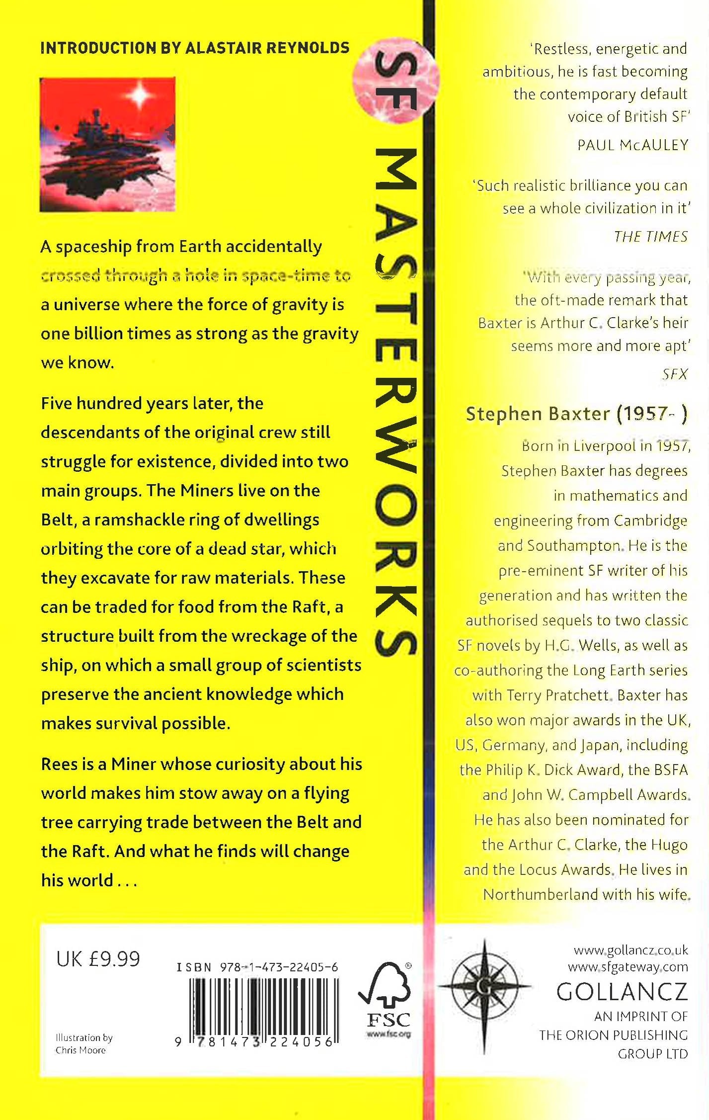 Stephen Baxter's highly acclaimed first novel and the beginning of his stunning Xeelee Sequence finally enters the SF Masterwork series! A spaceship from Earth accidentally crossed through a hole in space-time to a universe where the force of gravity is one billion times as strong as the gravity we know. Somehow the crew survived, aided by the fact that they emerged into a cloud of gas surrounding a black hole, which provided a breathable atmosphere. Five hundred years later, their descendants still struggle for existence, divided into two main groups. The Miners live on the Belt, a ramshackle ring of dwellings orbiting the core of a dead star, which they excavate for raw materials. These can be traded for food from the Raft, a structure built from the wreckage of the ship, on which a small group of scientists preserve the ancient knowledge which makes survival possible. Rees is a Miner whose curiosity about his world makes him stow away on a flying tree - just one of the many strange local lifeforms - carrying trade between the Belt and the Raft. And what he finds will change his world...