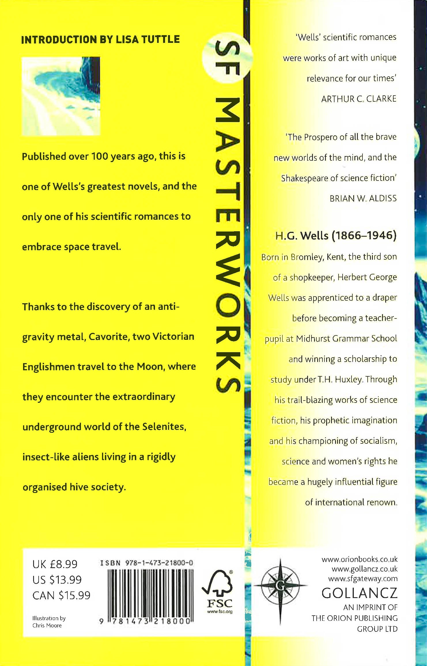 As we saw it first it was the wildest and most desolate of scenes. We were in an enormous amphitheatre, a vast circular plain, the floor of the giant crater. Its cliff-like wall closed us in on every side" Thanks to the discovery of an anti-gravity metal, Cavorite, two Victorian Englishman decide to tackle the most prestigious goal - space travel. They construct a sphere that will ultimately take them to the moon. On landing, they encounter what seems like an utterly barren landscape but they soon find signs that the planet was once very much alive. Then they hear curious hammering sounds from beneath the surface, and come face to face with the Selenites, a race of insect-like aliens living in a rigidly organised hive society.