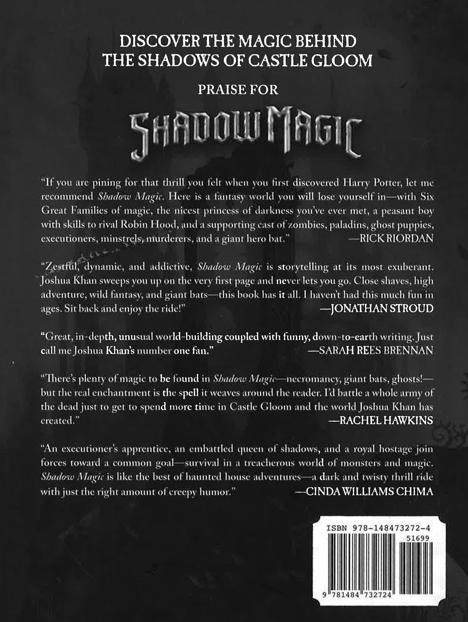 Thorn, an outlaw's son, wasn't supposed to be a slave. He's been sold to Tyburn, an executioner, and they're headed to Castle Gloom in Gehenna, the land of undead, where Thorn will probably be fed to a vampire. Lilith Shadow wasn't supposed to be ruler of Gehenna. But following the murder of her family, young Lily became the last surviving member of House Shadow, a long line of dark sorcerers. Her country is surrounded by enemies and the only way she can save it is by embracing her heritage and practicing the magic of the undead. But how can she when, as a girl, magic is forbidden to her? Just when it looks like Lily will have to leave her home forever, Thorn arrives at Castle Gloom. A sudden death brings them together, inspires them to break the rules, and leads them to soar to new heights in this fantasy with all the sparkle and luster of a starry night sky. Book 1 of a three book series. Advance Praise: "If you are pining for that thrill you felt when you first discovered Harry Potter, let me recommend SHADOW MAGIC. Here is a fantasy world you will lose yourself in--with Six Great Families of magic, the nicest princess of darkness you've ever met, a peasant boy with skills to rival Robin Hood, and a supporting cast of zombies, paladins, ghost puppies, executioners, minstrels, murderers, and a giant hero bat. I defy you not to love this story."--Rick Riordan "Zestful, dynamic and addictive, SHADOW MAGIC is storytelling at its most exuberant. Joshua Khan sweeps you up on the very first page and never lets you go. Close shaves, high adventure, wild fantasy, and giant bats--this book has it all. I haven't had this much fun in ages. Sit back and enjoy the ride!" --Jonathan Stroud