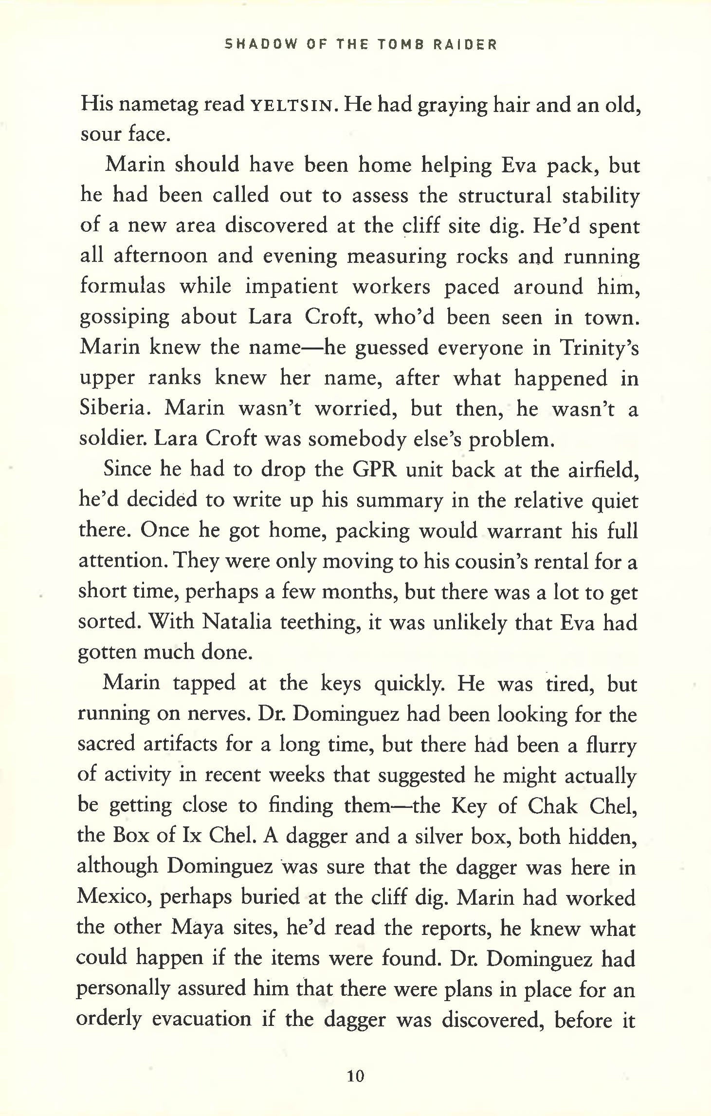 When a mysterious stranger offers to help Lara uncover a clue that could give her the upper hand, she embarks on an expedition to a system of caves in Colombia. However, once they learn of Lara's plans, Trinity will stop at nothing to reach the location first. Trinity believe they can turn the tables on Lara, but in the darkness of the underground caverns, there are terrors in the depths that neither Lara nor Trinity anticipated.