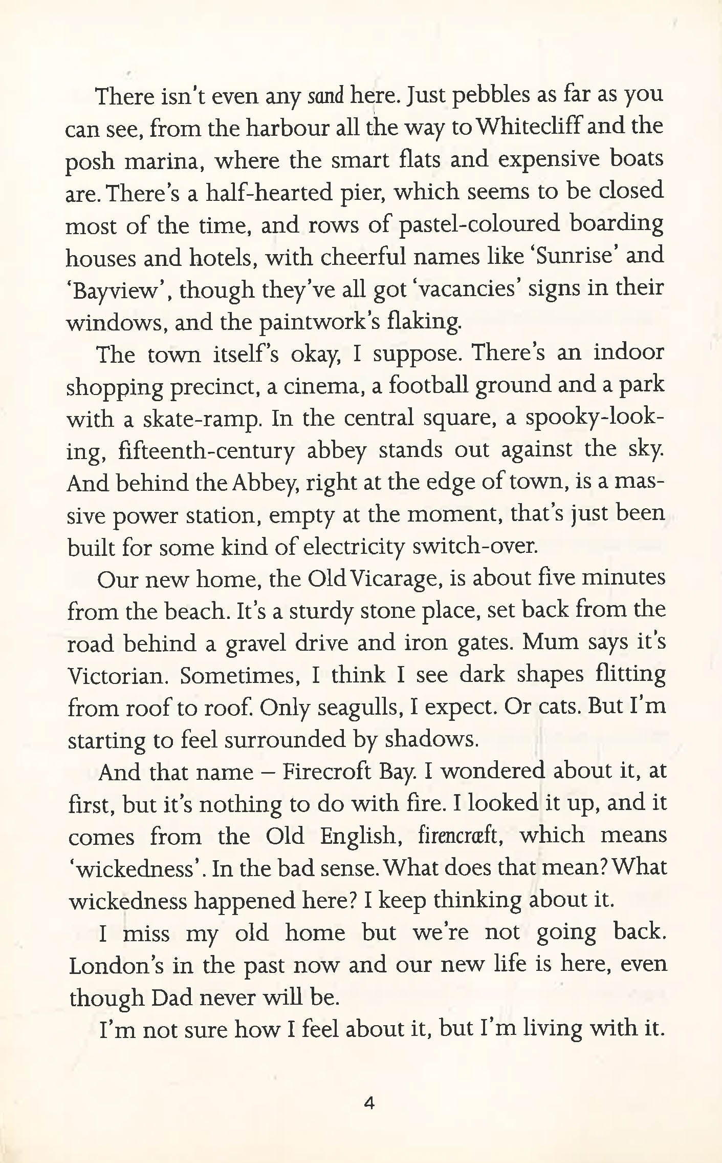 Twelve-year-old Miranda's new home is a dull seaside town, the sort of place where nothing ever happens. But things do begin to happen. Weird things. At school, Miranda meets a group of friends who seem to know something of what's going on. Together they set out to uncover the mystery \. and fast, before the evil that's shadowing her unleashes destruction. And to play her part, Miranda must face both the darkness within and the evil without.