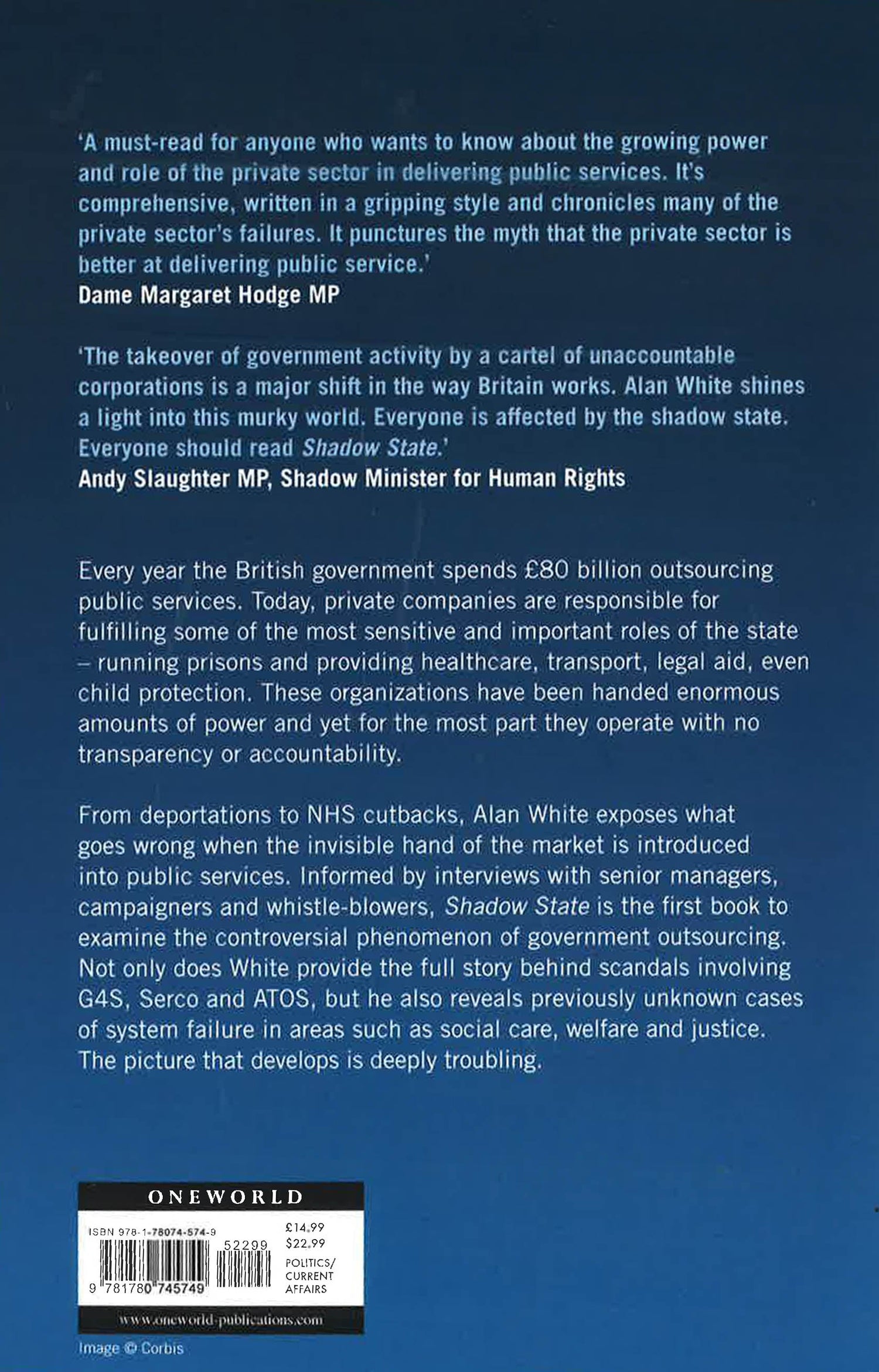 From deportations to NHS cutbacks, Alan White exposes what goes wrong when the invisible hand of the market is introduced into public services. Informed by exclusive interviews with senior managers, campaigners and whistle-blowers, Shadow State is the first book to examine the controversial phenomenon of government outsourcing. Not only does White provide the full story behind scandals involving G4S, Serco and ATOS, but he also reveals previously unknown cases of system failure in areas such as social care, welfare and justice. The picture that develops is deeply troubling.